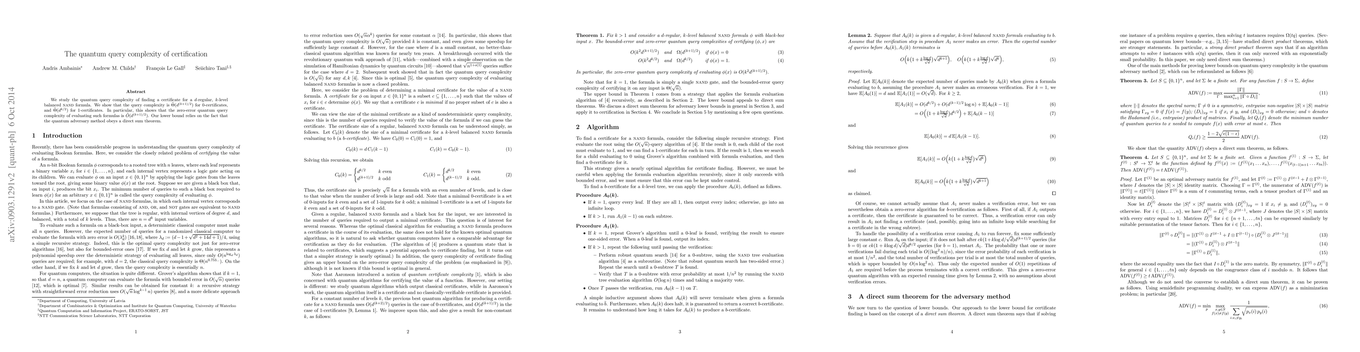 This paper investigates the quantum query complexity of certifying d-regular, k-level balanced NAND formulas, demonstrating that the complexity is Theta(d^{(k+1)/2}) for 0-certificates and Theta(d^{k/2}) for 1-certificates, establishing a zero-error quantum query complexity of O(d^{(k+1)/2}). The lower bound is derived using the quantum adversary method's adherence to a direct sum theorem.