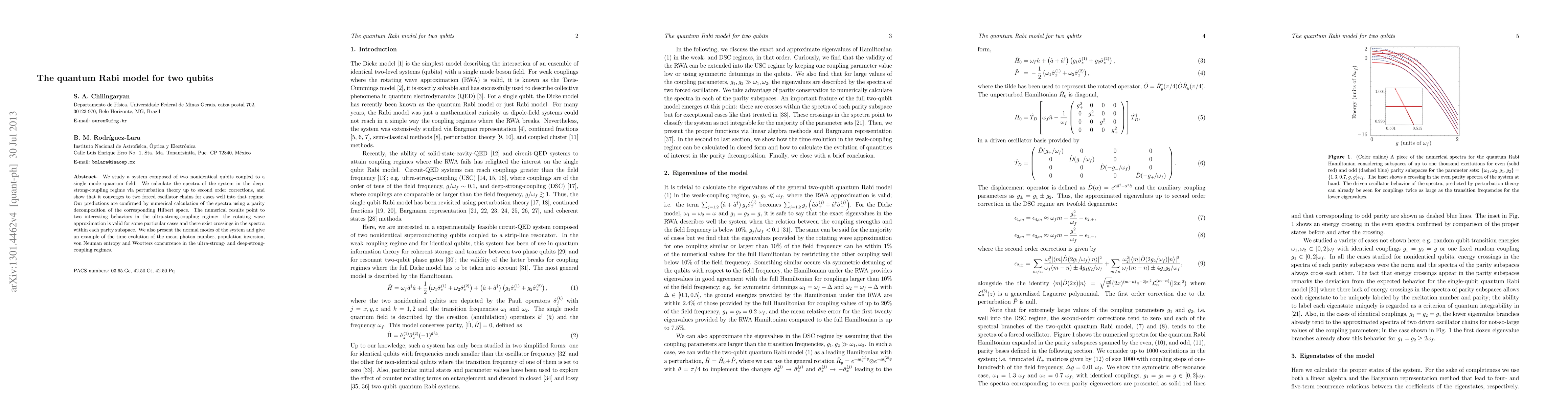 We study the two-qubit Rabi model in the most general case where the qubits are different from each other. The spectrum of the system in the ultrastrong-coupling regime is shown to converge to two forced oscillator chains by perturbation theory. An even and odd decomposition of the Hilbert space allows us to calculate the spectra in any given parameter regime; the cases studied confirm our perturbation theory prediction in the ultrastrong-coupling regime and point to crossings in the spectra within each parity subspace in the moderate-coupling regime. The normal modes of the system are calculated by two different methods, the first a linear algebra approach via the parity bases that delivers a four-term recurrence relation for the amplitudes of the proper states and, the second, via Bargmann representation for the field that delivers five-term recurrence relations. Finally, we show some examples of the time evolution of the mean photon number, population inversion, von Neuman entropy and Wootters concurrence under the two-qubit quantum Rabi Hamiltonian by taking advantage of the parity decomposition.
