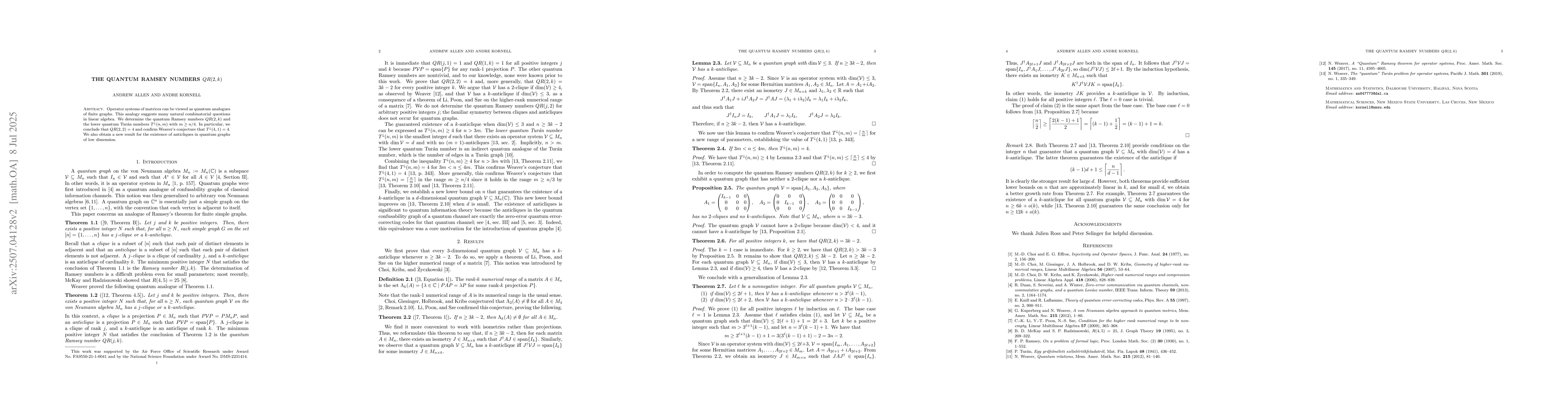 Operator systems of matrices can be viewed as quantum analogues of finite graphs. This analogy suggests many natural combinatorial questions in linear algebra. We determine the quantum Ramsey numbers $QR(2,k)$ and the lower quantum Tur\'an numbers $T^\downarrow(n, m)$ with $m \geq n/4$. In particular, we conclude that $QR(2,2) = 4$ and confirm Weaver's conjecture that $T^\downarrow(4, 1) = 4$. We also obtain a new result for the existence of anticliques in quantum graphs of low dimension.