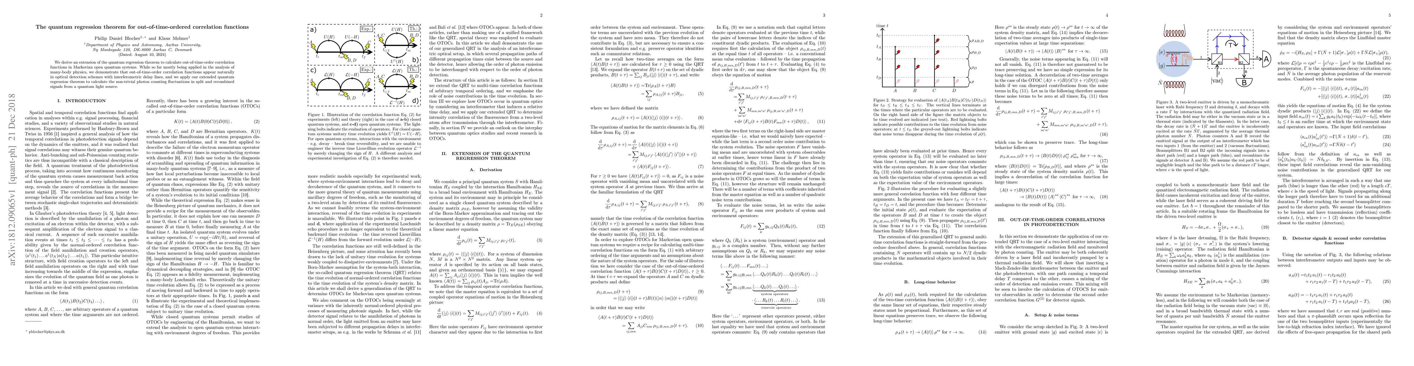 This paper extends the quantum regression theorem to compute out-of-time-order correlation functions in open quantum systems. It applies this extension to optical detection schemes, specifically calculating photon counting fluctuations in split and recombined signals from quantum light sources.