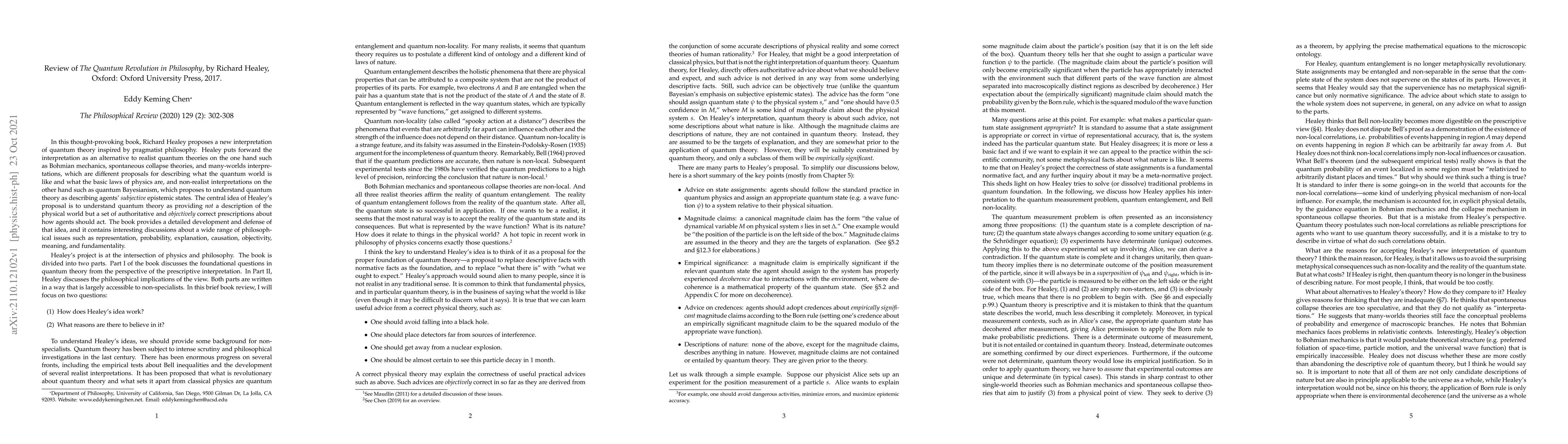 In this thought-provoking book, Richard Healey proposes a new interpretation of quantum theory inspired by pragmatist philosophy. Healey puts forward the interpretation as an alternative to realist quantum theories on the one hand such as Bohmian mechanics, spontaneous collapse theories, and many-worlds interpretations, which are different proposals for describing what the quantum world is like and what the basic laws of physics are, and non-realist interpretations on the other hand such as quantum Bayesianism, which proposes to understand quantum theory as describing agents' subjective epistemic states. The central idea of Healey's proposal is to understand quantum theory as providing not a description of the physical world but a set of authoritative and objectively correct prescriptions about how agents should act. The book provides a detailed development and defense of that idea, and it contains interesting discussions about a wide range of philosophical issues such as representation, probability, explanation, causation, objectivity, meaning, and fundamentality. Healey's project is at the intersection of physics and philosophy. The book is divided into two parts. Part I of the book discusses the foundational questions in quantum theory from the perspective of the prescriptive interpretation. In Part II, Healey discusses the philosophical implications of the view. Both parts are written in a way that is largely accessible to non-specialists. In this brief book review, I will focus on two questions: (1) How does Healey's idea work? (2) What reasons are there to believe in it?