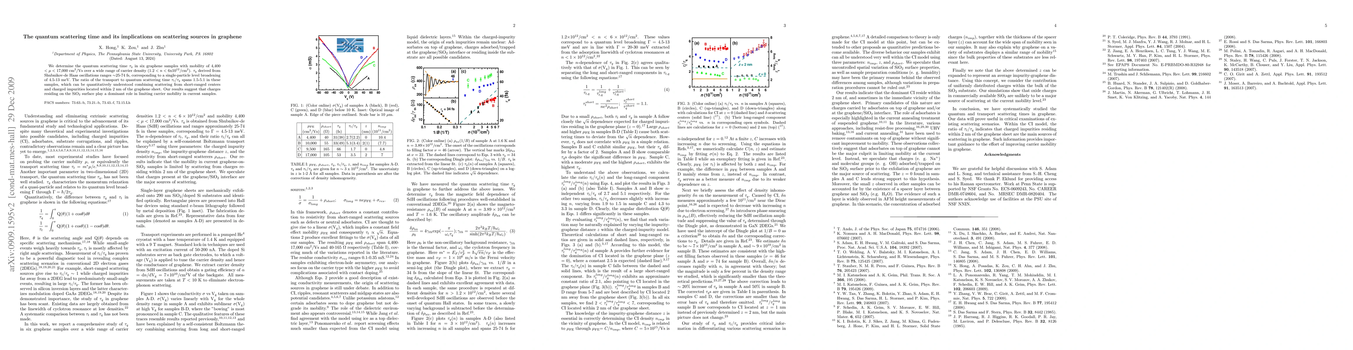The research determines quantum scattering time (tau_q) in various graphene samples, ranging from 25-74 fs, indicating carrier density-dependent broadening of 4.5-13 meV. The study reveals that charges on SiO_2 surface significantly impact graphene's carrier mobility, with the ratio of transport to quantum scattering time (tau_t/tau_q) varying from 1.5-5.1.