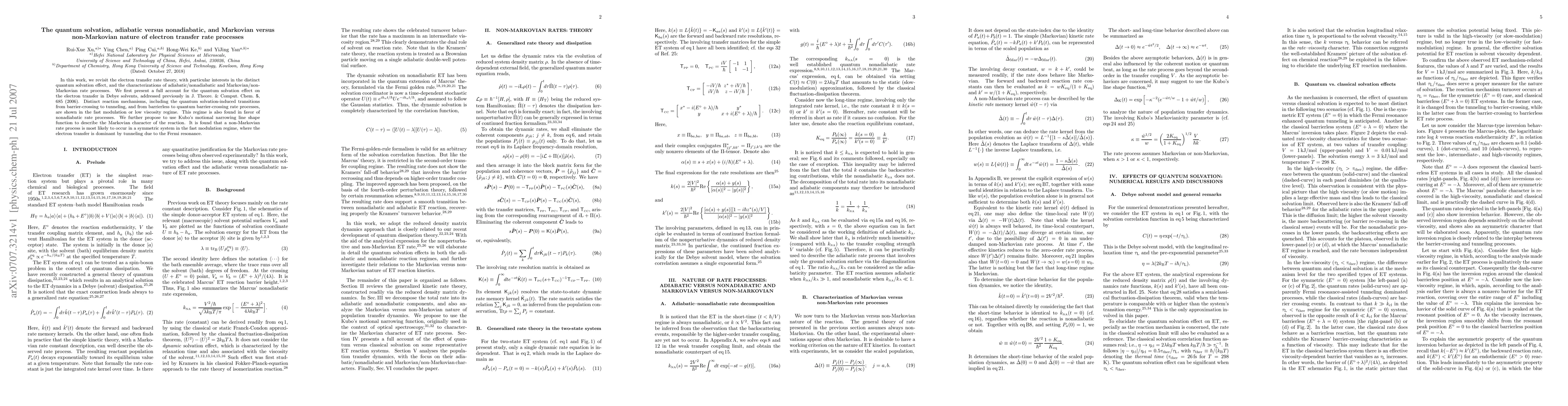 This paper examines the quantum solvation effects on electron transfer rates, highlighting the differences between adiabatic/nonadiabatic and Markovian/non-Markovian processes. It reveals that quantum solvation can lead to transitions from barrier-crossing to tunneling and shows that non-Markovian processes are more likely in symmetric systems due to Fermi resonance.