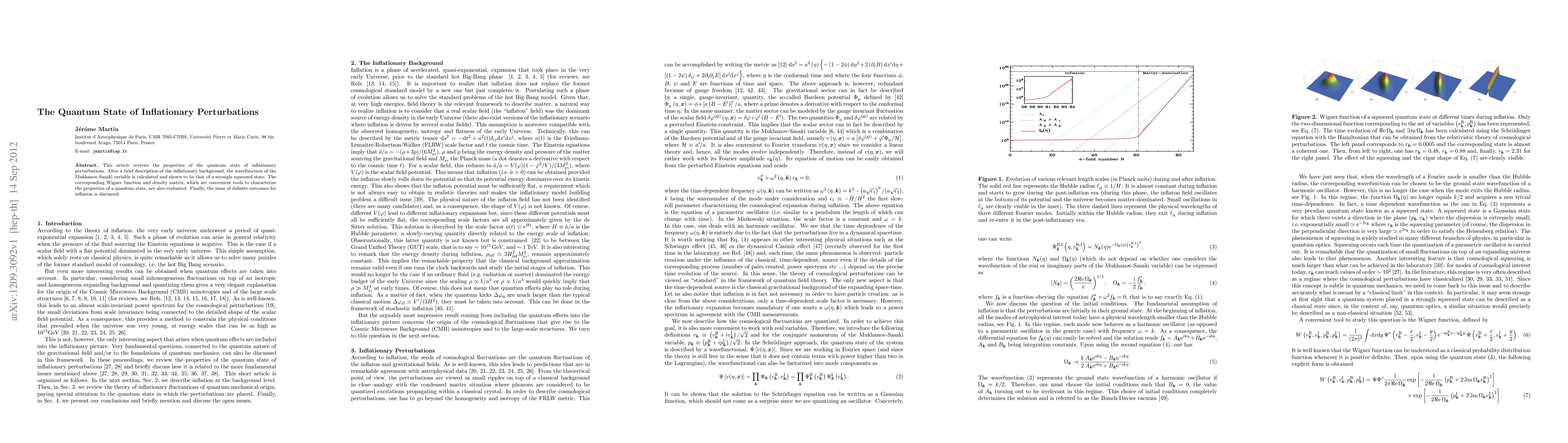 This article reviews the properties of the quantum state of inflationary perturbations. After a brief description of the inflationary background, the wavefunction of the Mukhanov-Sasaki variable is calculated and shown to be that of a strongly squeezed state. The corresponding Wigner function and density matrix, which are convenient tools to characterize the properties of a quantum state, are also evaluated. Finally, the issue of definite outcomes for inflation is discussed.
