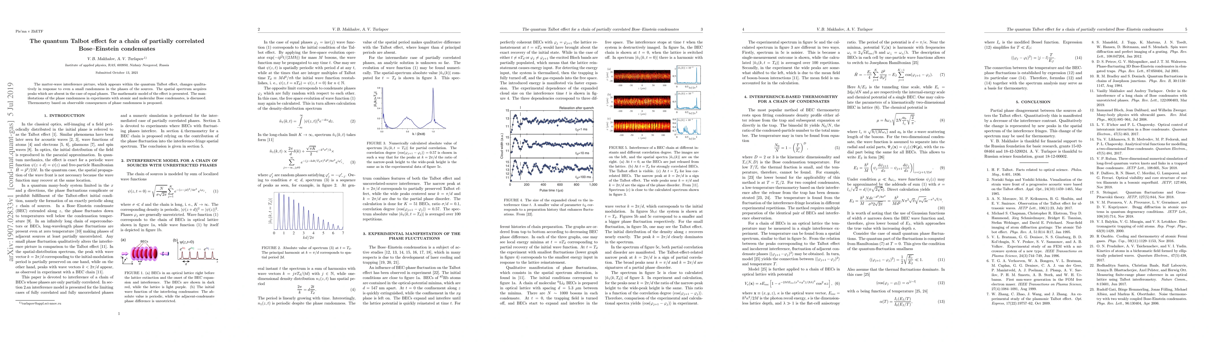 The quantum Talbot effect in a chain of partially correlated Bose-Einstein condensates reveals qualitative changes in matter-wave interference due to phase randomness, introducing new spatial spectrum peaks. A mathematical model is presented, and potential thermometry applications based on these effects are proposed.