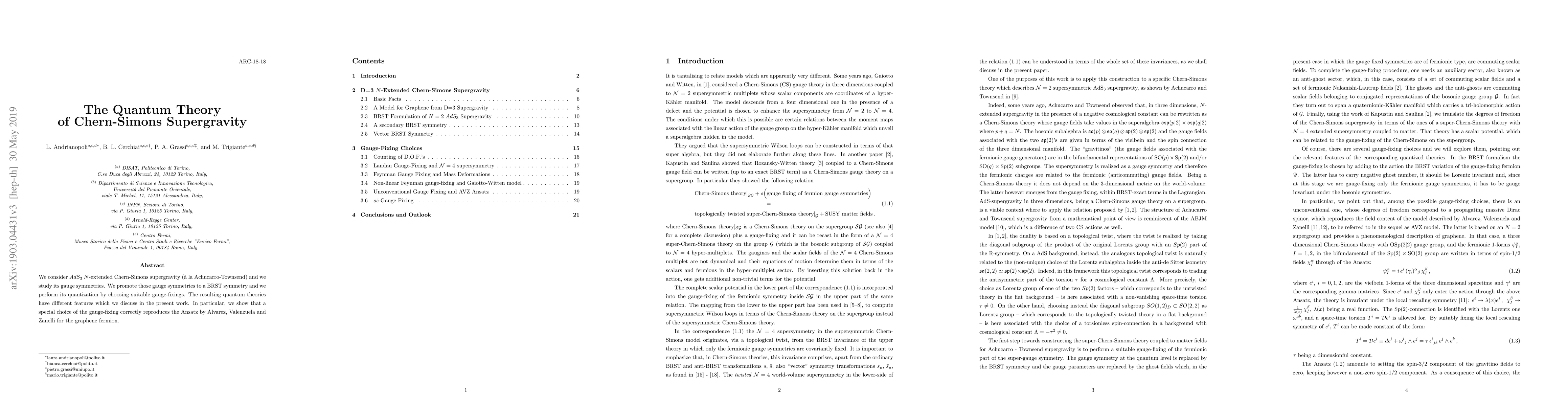 We consider $AdS_3$ $N$-extended Chern-Simons supergravity (\`a la Achucarro-Tonswend) and we study its gauge symmetries. We promote those gauge symmetries to a BRST symmetry and we perform its quantization by choosing suitable gauge-fixings. The resulting quantum theories have different features which we discuss in the present work. In particular, we show that a special choice of the gauge-fixing correctly reproduces the Ansatz by Alvarez, Valenzuela and Zanelli for the graphene fermion.