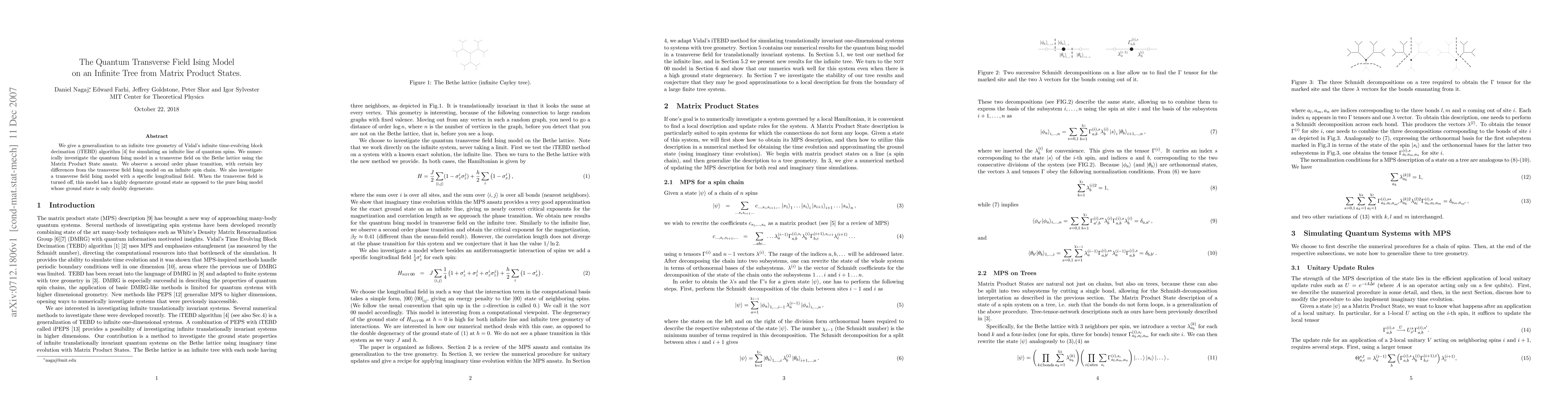 Summary: The paper generalizes an algorithm to simulate the quantum Ising model on an infinite tree using Matrix Product States, observing a second-order phase transition with unique features. It also examines a model with both transverse and longitudinal fields, noting a highly degenerate ground state when the transverse field is absent.