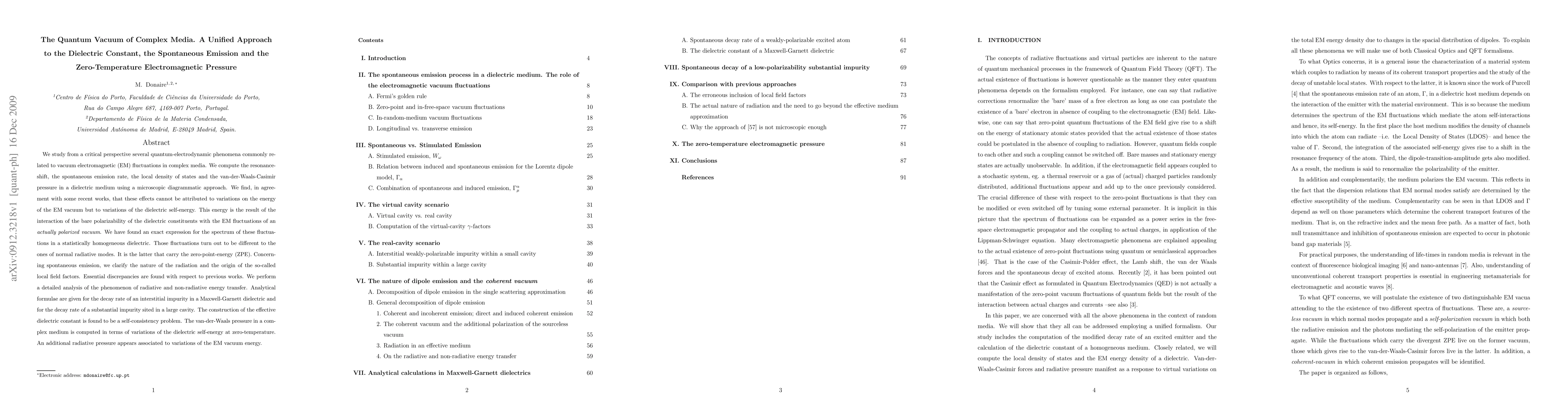 We study from a critical perspective several quantum-electrodynamic phenomena commonly related to vacuum electromagnetic (EM) fluctuations in complex media. We compute the resonance-shift, the spontaneous emission rate, the local density of states and the van-der-Waals-Casimir pressure in a dielectric medium using a microscopic diagrammatic approach. We find, in agreement with some recent works, that these effects cannot be attributed to variations on the energy of the EM vacuum but to variations of the dielectric self-energy. This energy is the result of the interaction of the bare polarizability of the dielectric constituents with the EM fluctuations of an actually polarized vacuum. We have found an exact expression for the spectrum of these fluctuations in a statistically homogeneous dielectric. Those fluctuations turn out to be different to the ones of normal radiative modes. It is the latter that carry the zero-point-energy (ZPE). Concerning spontaneous emission, we clarify the nature of the radiation and the origin of the so-called local field factors. Essential discrepancies are found with respect to previous works. We perform a detailed analysis of the phenomenon of radiative and non-radiative energy transfer. Analytical formulae are given for the decay rate of an interstitial impurity in a Maxwell-Garnett dielectric and for the decay rate of a substantial impurity sited in a large cavity. The construction of the effective dielectric constant is found to be a self-consistency problem. The van-der-Waals pressure in a complex medium is computed in terms of variations of the dielectric self-energy at zero-temperature. An additional radiative pressure appears associated to variations of the EM vacuum energy.