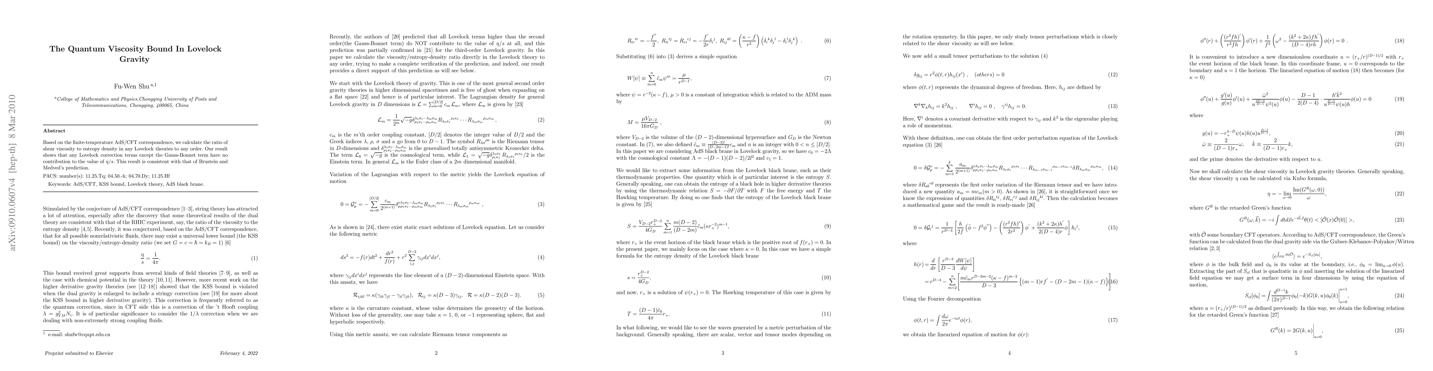 Based on the finite-temperature AdS/CFT correspondence, we calculate the ratio of shear viscosity to entropy density in any Lovelock theories to any order. Our result shows that any Lovelock correction terms except the Gauss-Bonnet term have no contribution to the value of $\eta/s$. This result is consistent with that of Brustein and Medved's prediction.