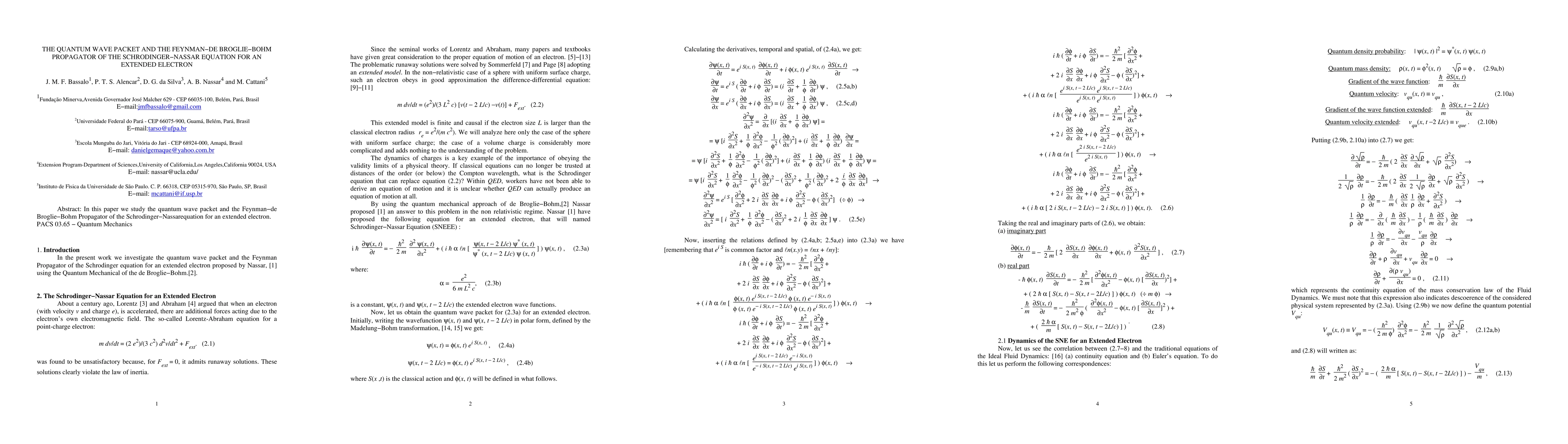 Summary: This research investigates the quantum wave packet dynamics and the Feynman-De Broglie-Bohm propagator within the framework of the Schrodinger-Nassar equation, focusing on an extended electron model. The study aims to provide insights into the behavior of quantum particles under these theoretical frameworks.