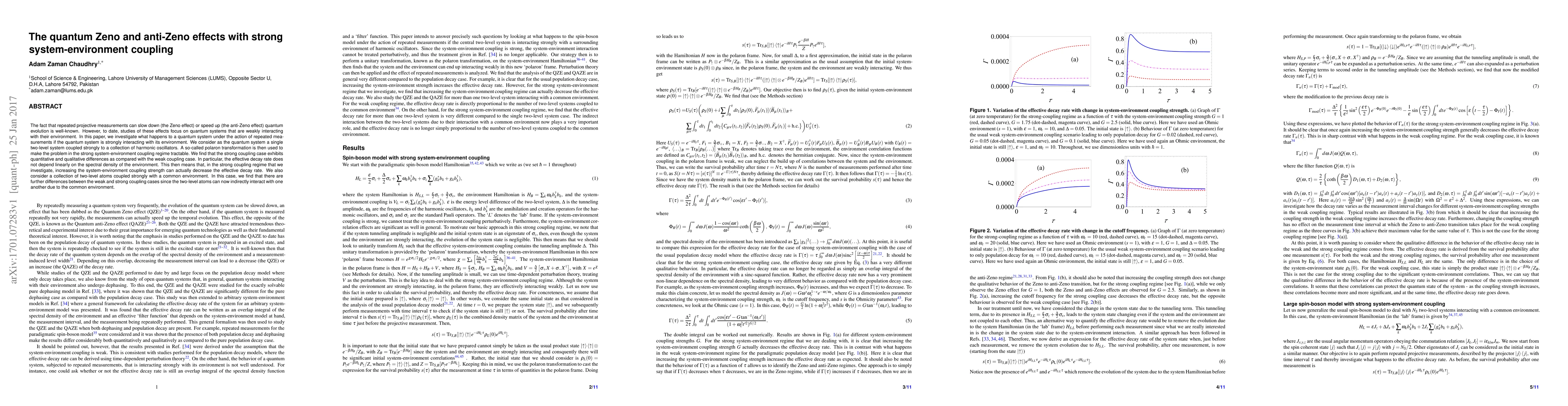 This paper explores the quantum Zeno and anti-Zeno effects in strongly interacting quantum systems, finding that strong coupling alters the effective decay rate and allows indirect interactions between coupled systems, unlike weakly interacting systems.