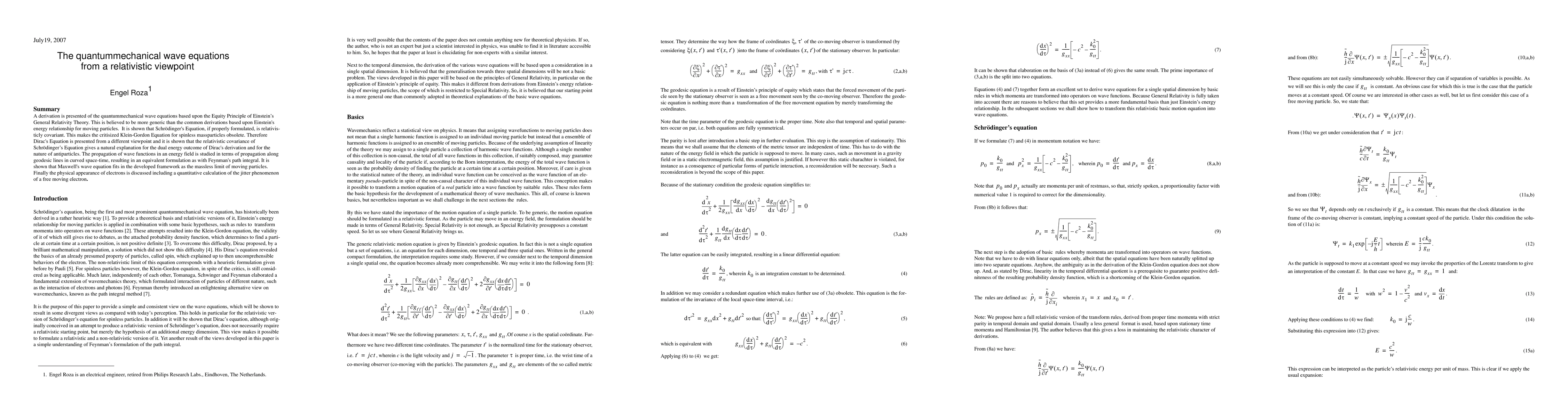 A derivation is presented of the quantummechanical wave equations based upon the Equity Principle of Einstein's General Relativity Theory. This is believed to be more generic than the common derivations based upon Einstein's energy relationship for moving particles. It is shown that Schrodinger's Equation, if properly formulated, is relativisticly covariant. This makes the critisized Klein-Gordon Equation for spinless massparticles obsolete. Therefore Dirac's Equation is presented from a different viewpoint and it is shown that the relativistic covariance of Schrodinger's Equation gives a natural explanation for the dual energy outcome of Dirac's derivation and for the nature of antiparticles. The propagation of wave functions in an energy field is studied in terms of propagation along geodesic lines in curved space-time, resulting in an equivalent formulation as with Feynman's path integral. It is shown that Maxwell's wave equation fits in the developed framework as the massless limit of moving particles. Finally the physical appearance of electrons is discussed including a quantitative calculation of the jitter phenomenon of a free moving electron.