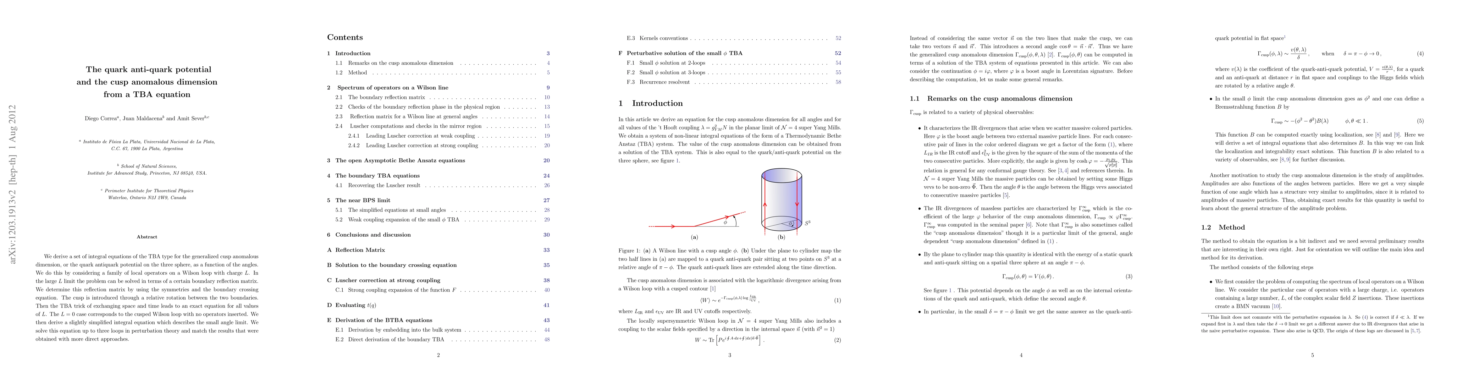 We derive a set of integral equations of the TBA type for the generalized cusp anomalous dimension, or the quark antiquark potential on the three sphere, as a function of the angles. We do this by considering a family of local operators on a Wilson loop with charge L. In the large L limit the problem can be solved in terms of a certain boundary reflection matrix. We determine this reflection matrix by using the symmetries and the boundary crossing equation. The cusp is introduced through a relative rotation between the two boundaries. Then the TBA trick of exchanging space and time leads to an exact equation for all values of L. The L=0 case corresponds to the cusped Wilson loop with no operators inserted. We then derive a slightly simplified integral equation which describes the small angle limit. We solve this equation up to three loops in perturbation theory and match the results that were obtained with more direct approaches.