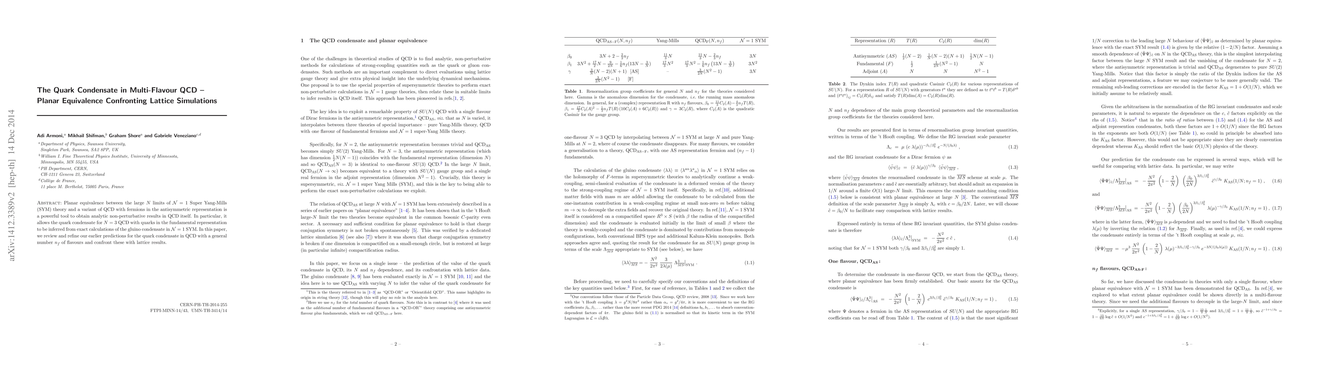 Planar equivalence between the large $N$ limits of ${\cal N}=1$ Super Yang-Mills (SYM) theory and a variant of QCD with fermions in the antisymmetric representation is a powerful tool to obtain analytic non-perturbative results in QCD itself. In particular, it allows the quark condensate for $N=3$ QCD with quarks in the fundamental representation to be inferred from exact calculations of the gluino condensate in ${\cal N}=1$ SYM. In this paper, we review and refine our earlier predictions for the quark condensate in QCD with a general number $n_f$ of flavours and confront these with lattice results.