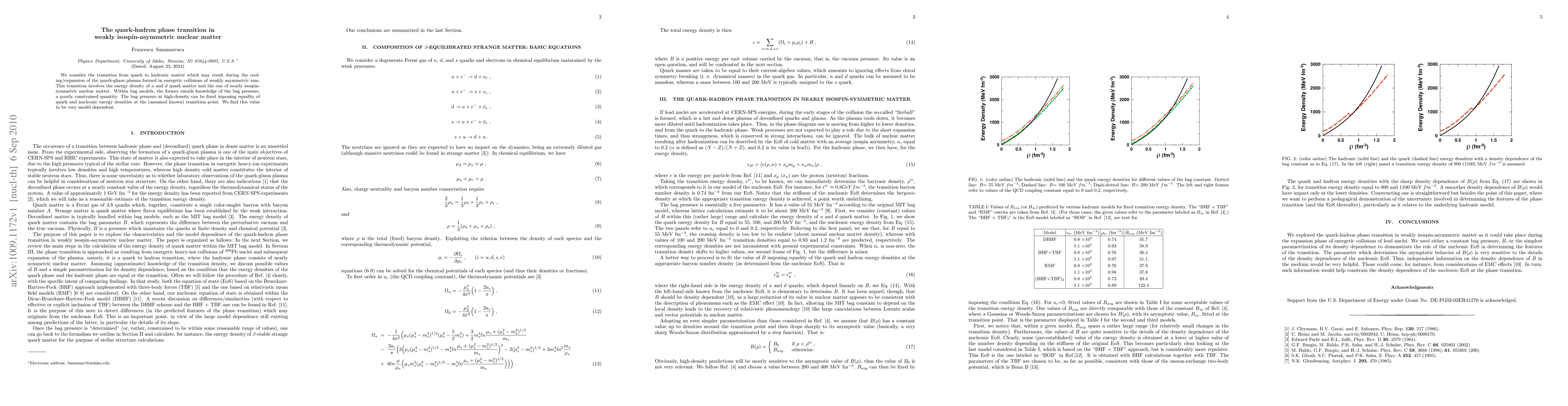 We consider the transition from quark to hadronic matter which may result during the cooling/expansion of the quark-gluon plasma formed in energetic collisions of weakly isospin-asymmetric ions. This transition involves the energy density of u and d quark matter and the one of nearly isospin-symmetric nuclear matter. Within bag models, the former entails knowledge of the bag pressure, a poorly constrained quantity. The bag pressure at high density can be fixed imposing equality of quark and nucleonic energy densities at the (assumed known) transition point. We find this value to be very model dependent.