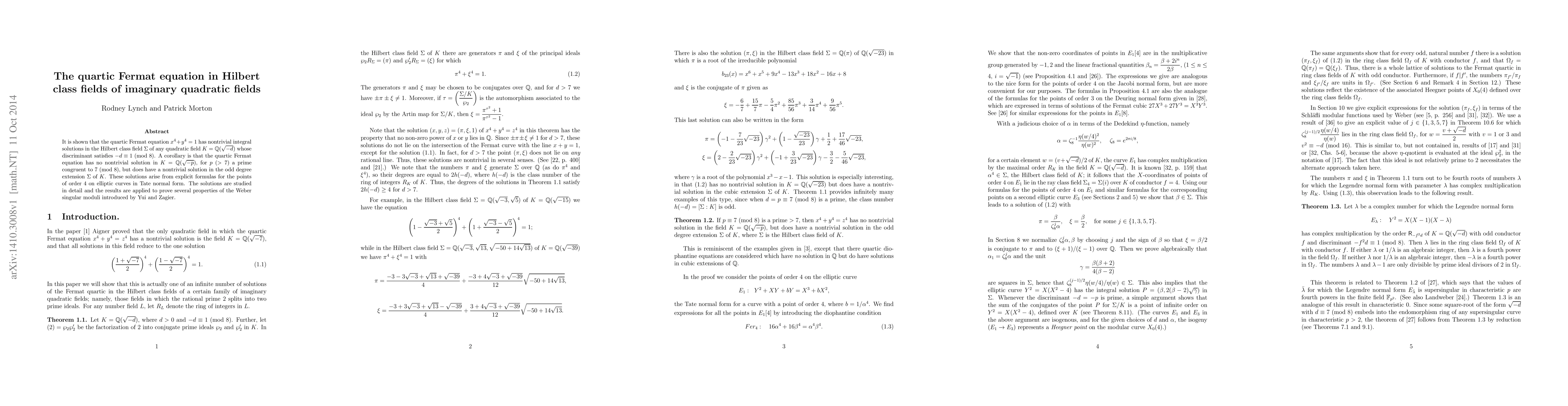 It is shown that the quartic Fermat equation $x^4 +y^4=1$ has nontrivial integral solutions in the Hilbert class field $\Sigma$ of any quadratic field $K=\mathbb{Q}(\sqrt{-d})$ whose discriminant satisfies $-d \equiv 1$ (mod 8). A corollary is that the quartic Fermat equation has no nontrivial solution in $K=\mathbb{Q}(\sqrt{-p})$, for $p$ $( > 7)$ a prime congruent to $7$ (mod 8), but does have a nontrivial solution in the odd degree extension $\Sigma$ of $K$. These solutions arise from explicit formulas for the points of order 4 on elliptic curves in Tate normal form. The solutions are studied in detail and the results are applied to prove several properties of the Weber singular moduli introduced by Yui and Zagier.