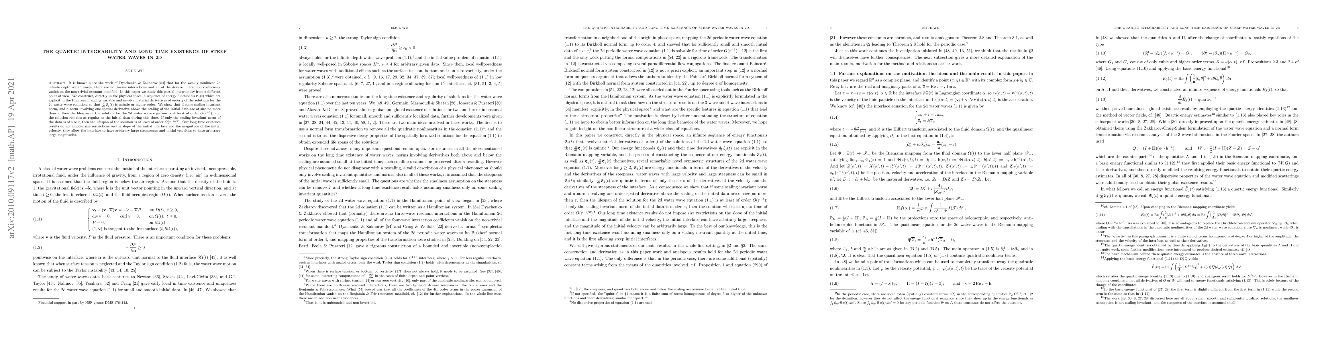 It is known since the work of Dyachenko \& Zakharov \cite{zd} that for the weakly nonlinear 2d infinite depth water waves, there are no 3-wave interactions and all of the 4-wave interaction coefficients vanish on the non-trivial resonant manifold. In this paper we study this partial integrability from a different point of view. We construct, directly in the physical space, a sequence of energy functionals $\mathfrak E_j(t)$ which are explicit in the Riemann mapping variable and involve material derivatives of order $j$ of the solutions for the 2d water wave equation, so that $\frac d{dt} \mathfrak E_j(t)$ is quintic or higher order. We show that if some scaling invariant norm, and a norm involving one spatial derivative above the scaling of the initial data are of size no more than $\varepsilon$, then the lifespan of the solution for the 2d water wave equation is at least of order $O(\varepsilon^{-3})$, and the solution remains as regular as the initial data during this time. If only the scaling invariant norm of the data is of size $\varepsilon$, then the lifespan of the solution is at least of order $O(\varepsilon^{-5/2})$. Our long time existence results do not impose size restrictions on the slope of the initial interface and the magnitude of the initial velocity, they allow the interface to have arbitrary large steepnesses and initial velocities to have arbitrary large magnitudes.
