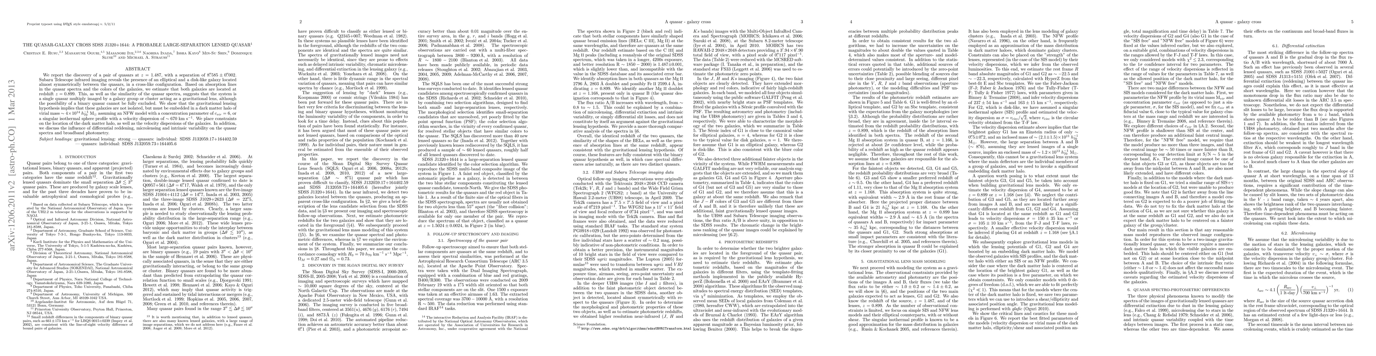 We report the discovery of a pair of quasars at $z=1.487$, with a separation of $8\farcs585\pm0\farcs002$. Subaru Telescope infrared imaging reveals the presence of an elliptical and a disk-like galaxy located almost symmetrically between the quasars, creating a cross-like configuration. Based on absorption lines in the quasar spectra and the colors of the galaxies, we estimate that both galaxies are located at redshift $z=0.899$. This, as well as the similarity of the quasar spectra, suggests that the system is a single quasar multiply imaged by a galaxy group or cluster acting as a gravitational lens, although the possibility of a binary quasar cannot be fully excluded. We show that the gravitational lensing hypothesis implies these galaxies are not isolated, but must be embedded in a dark matter halo of virial mass $\sim 4 \times 10^{14}\ h_{70}^{-1}\ {M}_\odot$ assuming an NFW model with a concentration parameter of $c_{vir}=6$, or a singular isothermal sphere profile with a velocity dispersion of $\sim 670$ km s$^{-1}$. We place constraints on the location of the dark matter halo, as well as the velocity dispersions of the galaxies. In addition, we discuss the influence of differential reddening, microlensing and intrinsic variability on the quasar spectra and broadband photometry.
