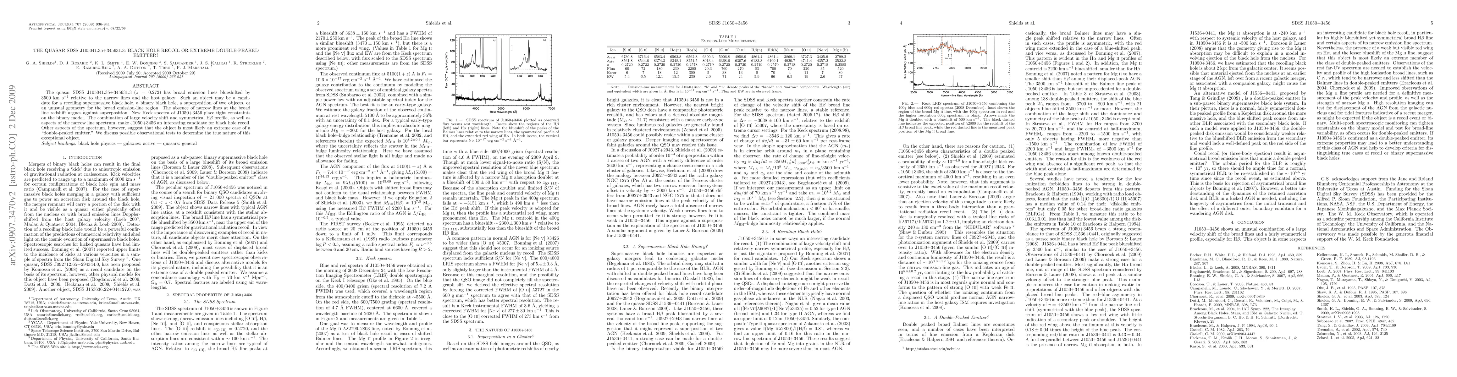 The quasar SDSS J105041.35+345631.3 exhibits broad emission lines blueshifted by 3500 km/s, potentially indicating a recoiling supermassive black hole or an extreme double-peaked emitter. New Keck spectra suggest it is most likely an unusual double-peaked emitter, though black hole recoil remains a possibility.