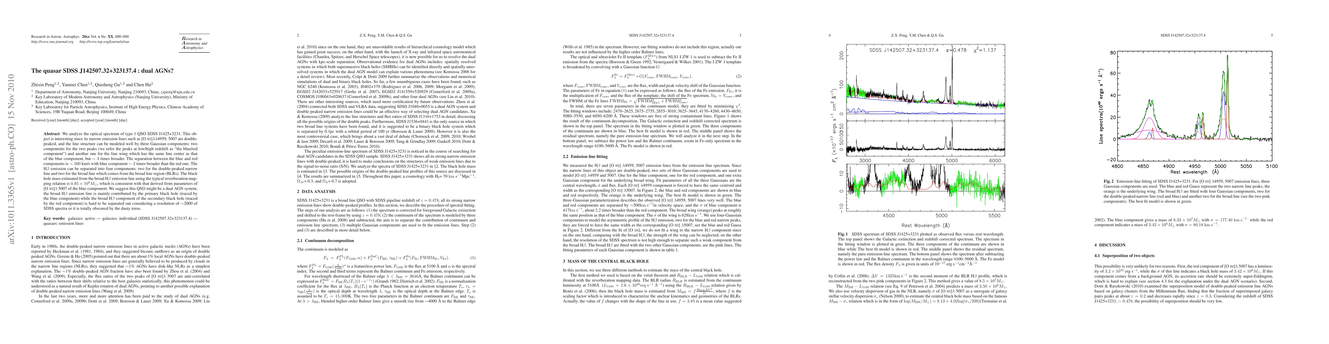 We analyze the optical spectrum of type 1 QSO SDSS J1425+3231. This ob- ject is interesting since its narrow emission lines such as [O III]{\lambda}{\lambda}4959, 5007 are double- peaked, and the line structure can be modeled well by three Gaussian components: two components for the two peaks (we refer the peaks at low/high redshift as "the blue/red component") and another one for the line wing which has the same line center as that of the blue component, but ~ 3 times broader. The separation between the blue and red components is ~ 500 km/s with blue component ~ 2 times broader than the red one. The H{\beta} emission can be separated into four components: two for the double-peaked narrow line and two for the broad line which comes from the broad line region (BLRs). The black hole mass estimated from the broad H{\beta} emission line using the typical reverberation map- ping relation is 0.85 \times 108M\odot, which is consistent with that derived from parameters of [O III]{\lambda} 5007 of the blue component. We suggest this QSO might be a dual AGN system, the broad H{\beta} emission line is mainly contributed by the primary black hole (traced by the blue component) while the broad H{\beta} component of the secondary black hole (traced by the red component) is hard to be separated out considering a resolution of ~2000 of SDSS spectra or it is totally obscured by the dusty torus.