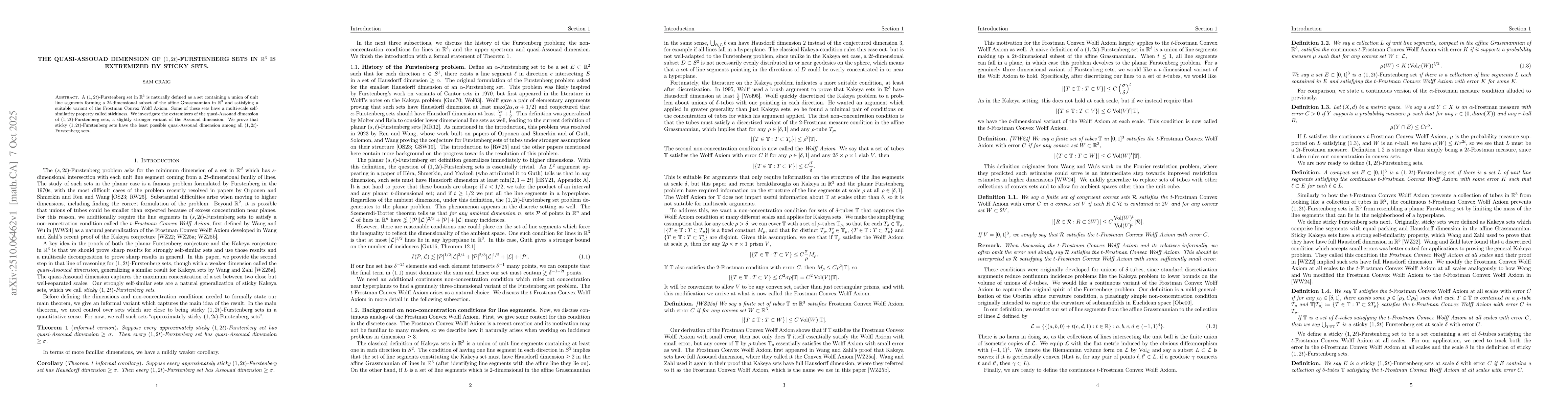 A $(1,2t)$-Furstenberg set in $\mathbb{R}^3$ is naturally defined as a set containing a union of unit line segments forming a $2t$-dimensional subset of the affine Grassmannian in $\mathbb{R}^3$ and satisfying a suitable variant of the Frostman Convex Wolff Axiom. Some of these sets have a multi-scale self-similarity property called stickiness. We investigate the extremizers of the quasi-Assouad dimension of $(1,2t)$-Furstenberg sets, a slightly stronger variant of the Assouad dimension. We prove that sticky $(1,2t)$-Furstenberg sets have the least possible quasi-Assouad dimension among all $(1,2t)$-Furstenberg sets.