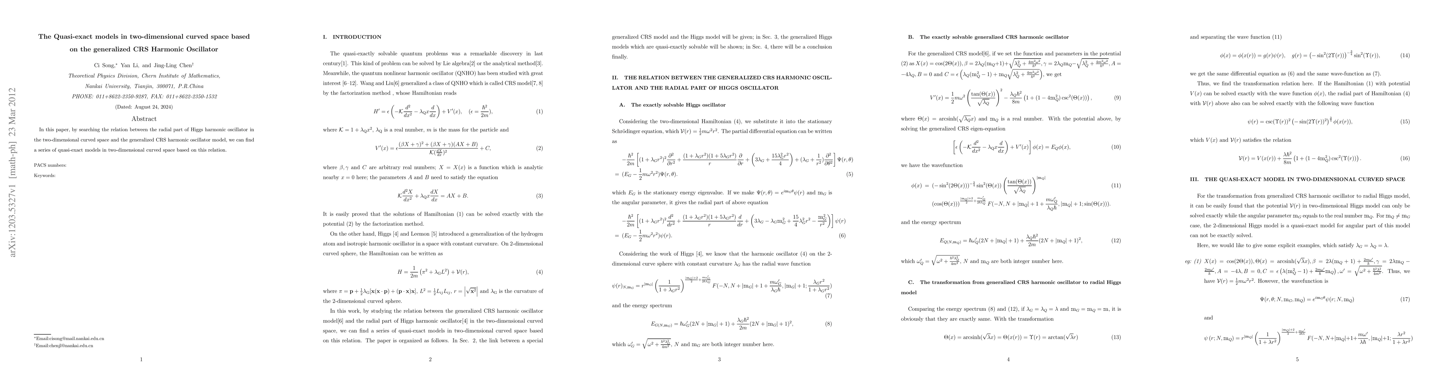 Researchers discovered a series of quasi-exact models in 2D curved space based on the relation between Higgs harmonic oscillator and generalized CRS Harmonic Oscillator model.