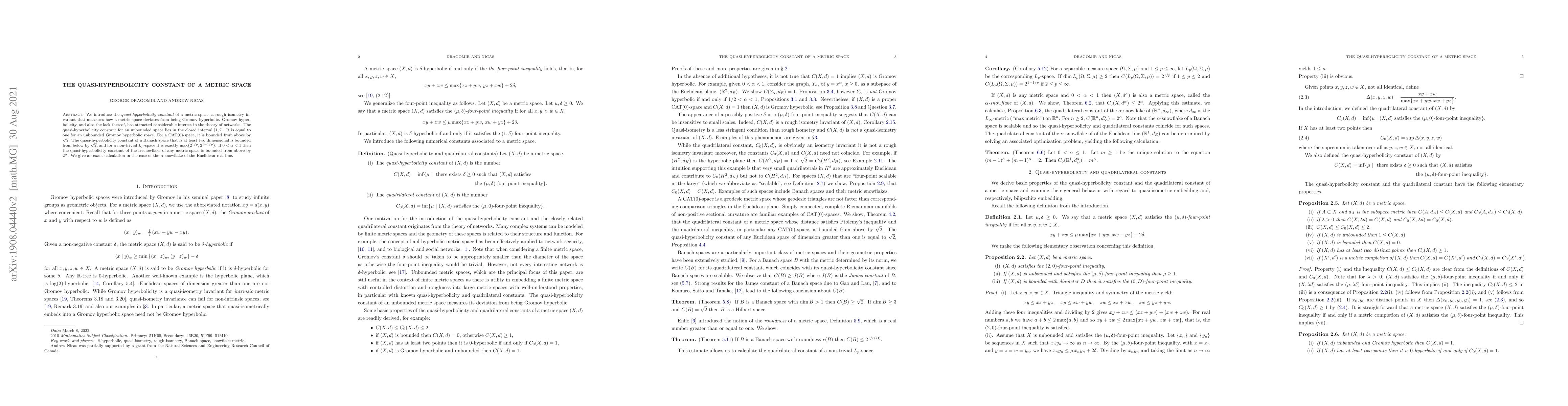 We introduce the quasi-hyperbolicity constant of a metric space, a rough isometry invariant that measures how a metric space deviates from being Gromov hyperbolic. This number, for unbounded spaces, lies in the closed interval $[1,2]$. The quasi-hyperbolicity constant of an unbounded Gromov hyperbolic space is equal to one. For a CAT$(0)$-space, it is bounded from above by $\sqrt{2}$. The quasi-hyperbolicity constant of a Banach space that is at least two dimensional is bounded from below by $\sqrt{2}$, and for a non-trivial $L_p$-space it is exactly $\max\{2^{1/p},2^{1-1/p}\}$. If $0 < \alpha < 1$ then the quasi-hyperbolicity constant of the $\alpha$-snowflake of any metric space is bounded from above by $2^\alpha$. We give an exact calculation in the case of the $\alpha$-snowflake of the Euclidean real line.