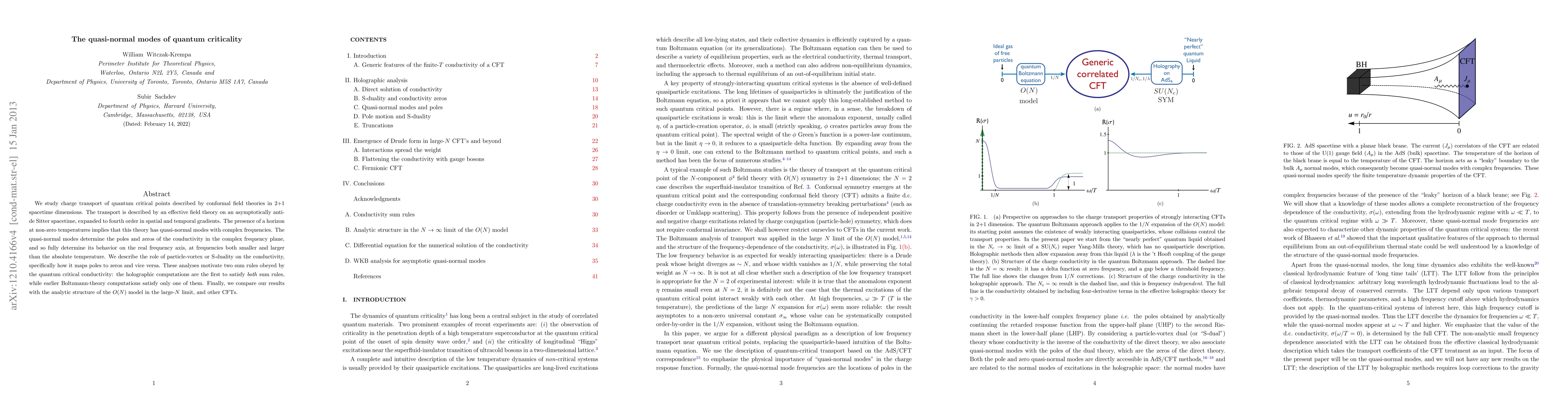 We study charge transport of quantum critical points described by conformal field theories in 2+1 spacetime dimensions. The transport is described by an effective field theory on an asymptotically anti-de Sitter spacetime, expanded to fourth order in spatial and temporal gradients. The presence of a horizon at non-zero temperatures implies that this theory has quasi-normal modes with complex frequencies. The quasi-normal modes determine the poles and zeros of the conductivity in the complex frequency plane, and so fully determine its behavior on the real frequency axis, at frequencies both smaller and larger than the absolute temperature. We describe the role of particle-vortex or S-duality on the conductivity, specifically how it maps poles to zeros and vice versa. These analyses motivate two sum rules obeyed by the quantum critical conductivity: the holographic computations are the first to satisfy both sum rules, while earlier Boltzmann-theory computations satisfy only one of them. Finally, we compare our results with the analytic structure of the O(N) model in the large-N limit, and other CFTs.
