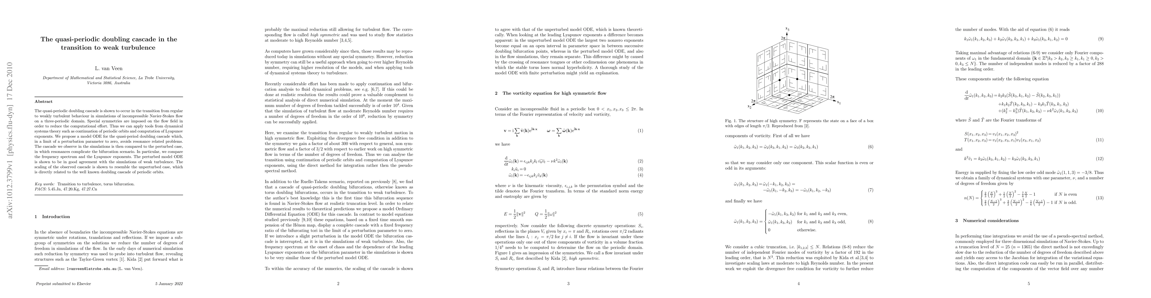 The quasi-periodic doubling cascade is shown to occur in the transition from regular to weakly turbulent behaviour in simulations of incompressible Navier-Stokes flow on a three-periodic domain. Special symmetries are imposed on the flow field in order to reduce the computational effort. Thus we can apply tools from dynamical systems theory such as continuation of periodic orbits and computation of Lyapunov exponents. We propose a model ODE for the quasi-period doubling cascade which, in a limit of a perturbation parameter to zero, avoids resonance related problems. The cascade we observe in the simulations is then compared to the perturbed case, in which resonances complicate the bifurcation scenario. In particular, we compare the frequency spectrum and the Lyapunov exponents. The perturbed model ODE is shown to be in good agreement with the simulations of weak turbulence. The scaling of the observed cascade is shown to resemble the unperturbed case, which is directly related to the well known doubling cascade of periodic orbits.