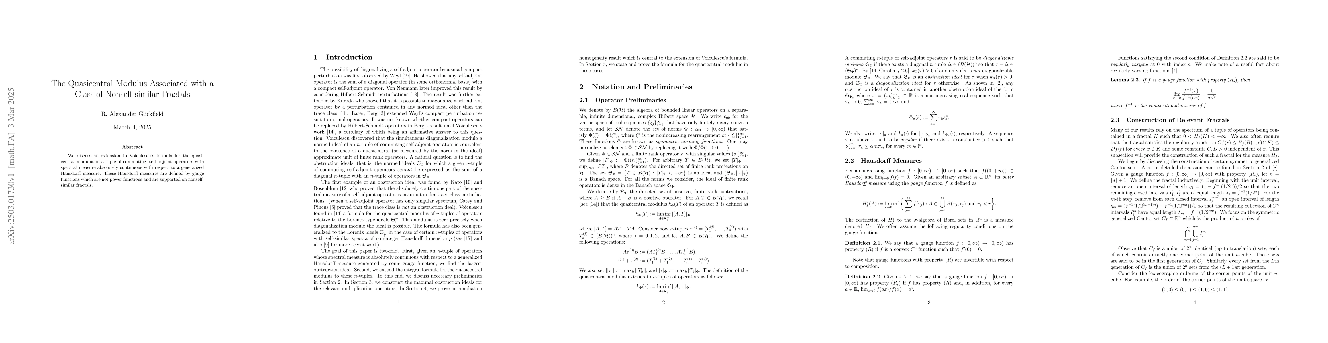 The research extends Voiculescu's formula for the quasicentral modulus to tuples of commuting, self-adjoint operators with spectral measures absolutely continuous to generalized Hausdorff measures defined by non-power gauge functions, supported on nonself-similar fractals.
