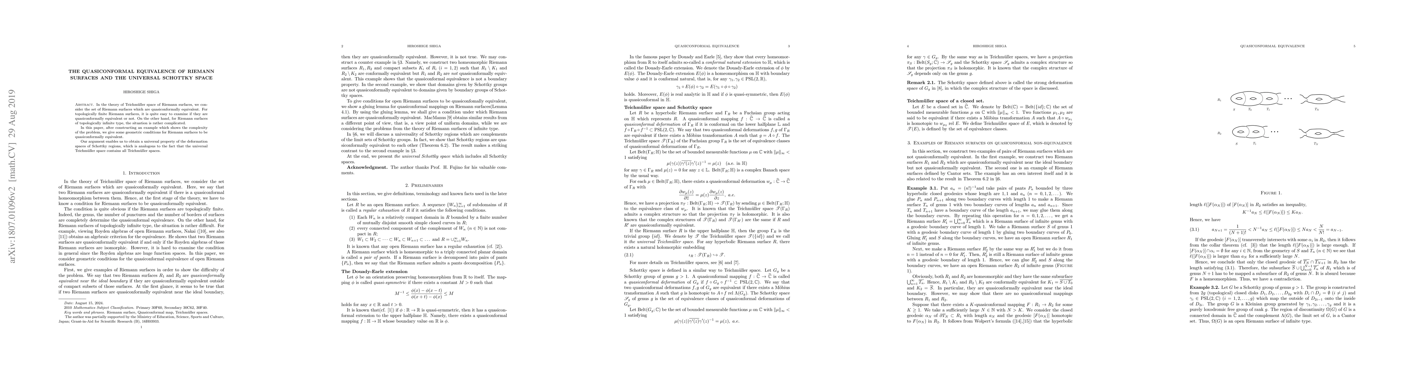 This paper explores the quasiconformal equivalence of Riemann surfaces, particularly focusing on the complexity of determining such equivalence for surfaces of topologically infinite type. It provides geometric conditions for equivalence and constructs the universal Schottky space, analogous to the universal Teichmüller space.