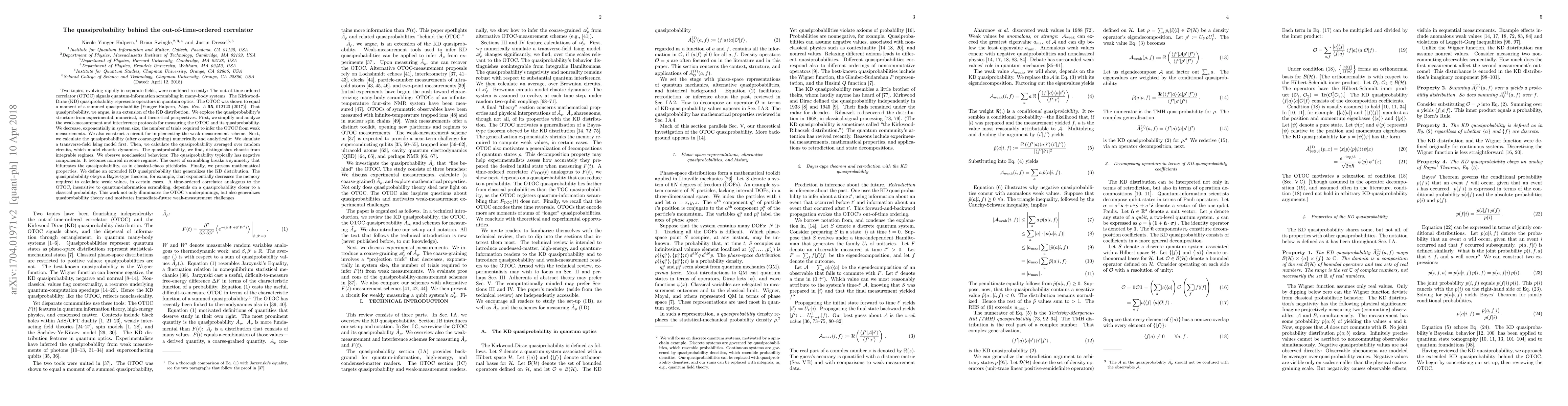 Two topics, evolving rapidly in separate fields, were combined recently: The out-of-time-ordered correlator (OTOC) signals quantum-information scrambling in many-body systems. The Kirkwood-Dirac (KD) quasiprobability represents operators in quantum optics. The OTOC has been shown to equal a moment of a summed quasiprobability. That quasiprobability, we argue, is an extension of the KD distribution. We explore the quasiprobability's structure from experimental, numerical, and theoretical perspectives. First, we simplify and analyze the weak-measurement and interference protocols for measuring the OTOC and its quasiprobability. We decrease, exponentially in system size, the number of trials required to infer the OTOC from weak measurements. We also construct a circuit for implementing the weak-measurement scheme. Next, we calculate the quasiprobability (after coarse-graining) numerically and analytically: We simulate a transverse-field Ising model first. Then, we calculate the quasiprobability averaged over random circuits, which model chaotic dynamics. The quasiprobability, we find, distinguishes chaotic from integrable regimes. We observe nonclassical behaviors: The quasiprobability typically has negative components. It becomes nonreal in some regimes. The onset of scrambling breaks a symmetry that bifurcates the quasiprobability, as in classical-chaos pitchforks. Finally, we present mathematical properties. The quasiprobability obeys a Bayes-type theorem, for example, that exponentially decreases the memory required to calculate weak values, in certain cases. A time-ordered correlator analogous to the OTOC, insensitive to quantum-information scrambling, depends on a quasiprobability closer to a classical probability. This work not only illuminates the OTOC's underpinnings, but also generalizes quasiprobability theory and motivates immediate-future weak-measurement challenges.
