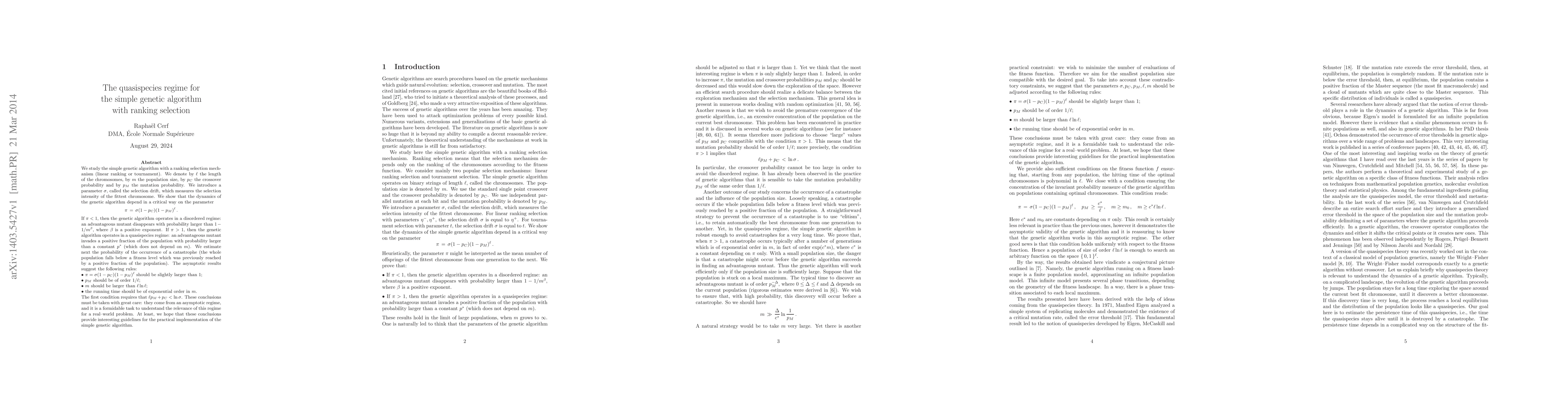 This paper investigates the dynamics of a simple genetic algorithm with ranking selection, identifying two regimes: a disordered regime where advantageous mutants are lost, and a quasispecies regime where they invade the population. The critical parameter $\pi$ determines regime behavior, with $\pi > 1$ indicating a quasispecies regime. The study provides guidelines for parameter settings, though caution is advised due to the asymptotic nature of the results.