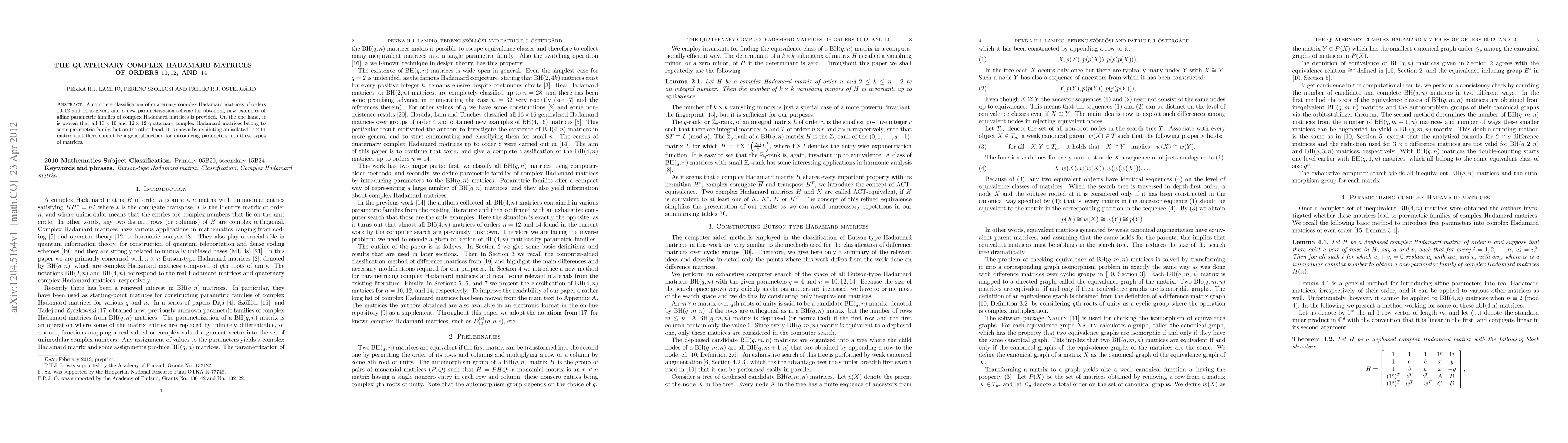 Researchers classified quaternary complex Hadamard matrices of orders 10, 12, and 14, showing that some belong to parametric families but no general method exists for others.