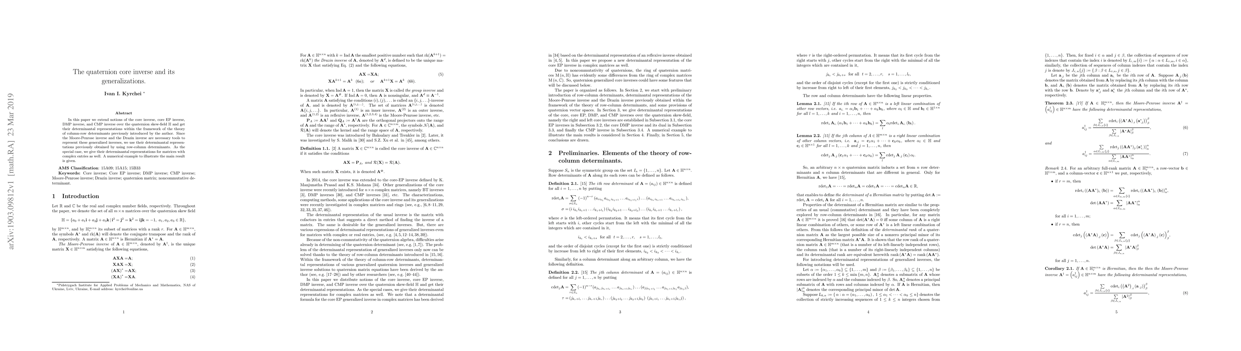 This paper extends the concepts of core inverses and related generalized inverses to the quaternion skew-field ${\mathbb{H}}$, providing their determinantal representations using column-row determinants. Special cases for complex matrices are also considered, with a numerical example provided for illustration.