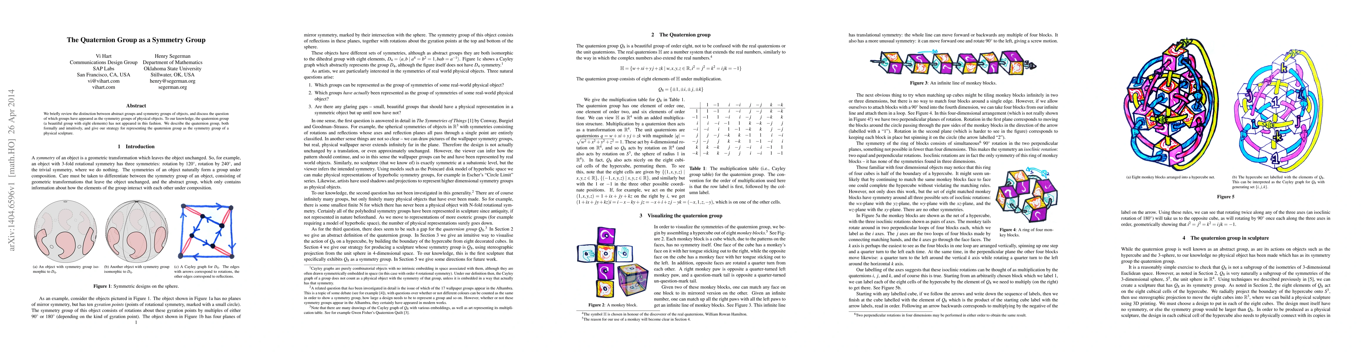 The paper presents a novel method for visualizing and representing the quaternion group as a symmetry group of a physical sculpture using four-dimensional projections and stereographic projections.