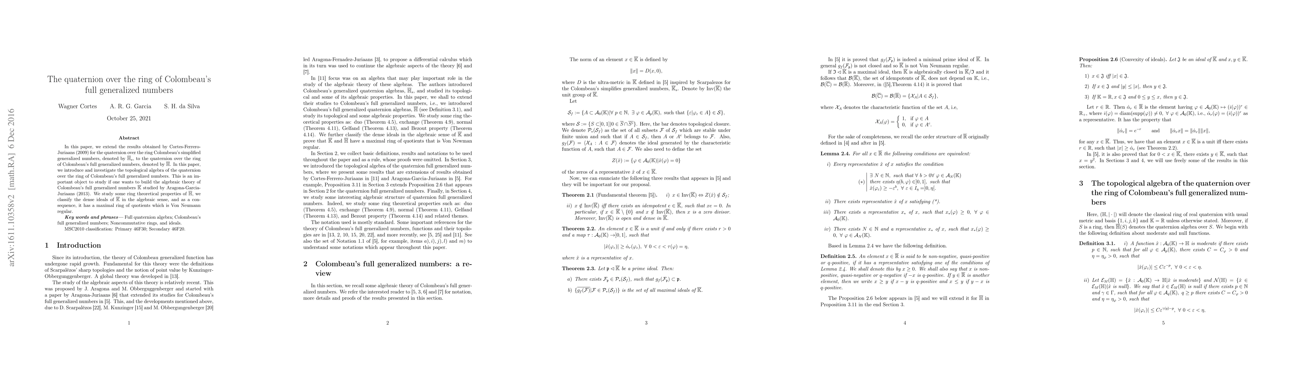 In this paper, we extend the results obtained by Cortes-Ferrero-Juriaans (2009) for the quaternion over the ring Colombeau's simplified generalized numbers, denoted by $\overline{\mathbb{H}}_s$, to the quaternion over the ring of Colombeau's full generalized numbers, denoted by $\overline{\mathbb{H}}$. In this paper, we introduce and investigate the topological algebra of the quaternion over the ring of Colombeau's full generalized numbers. This is an important object to study if one wants to build the algebraic theory of Colombeau's full generalized numbers $\overline{\mathbb{K}}$ studied by Aragona-Garcia-Juriaans (2013). We study some ring theoretical properties of $\overline{\mathbb{H}}$, we classify the dense ideals of $\overline{\mathbb{K}}$ in the algebraic sense, and as a consequence, it has a maximal ring of quotients which is Von Neumann regular.