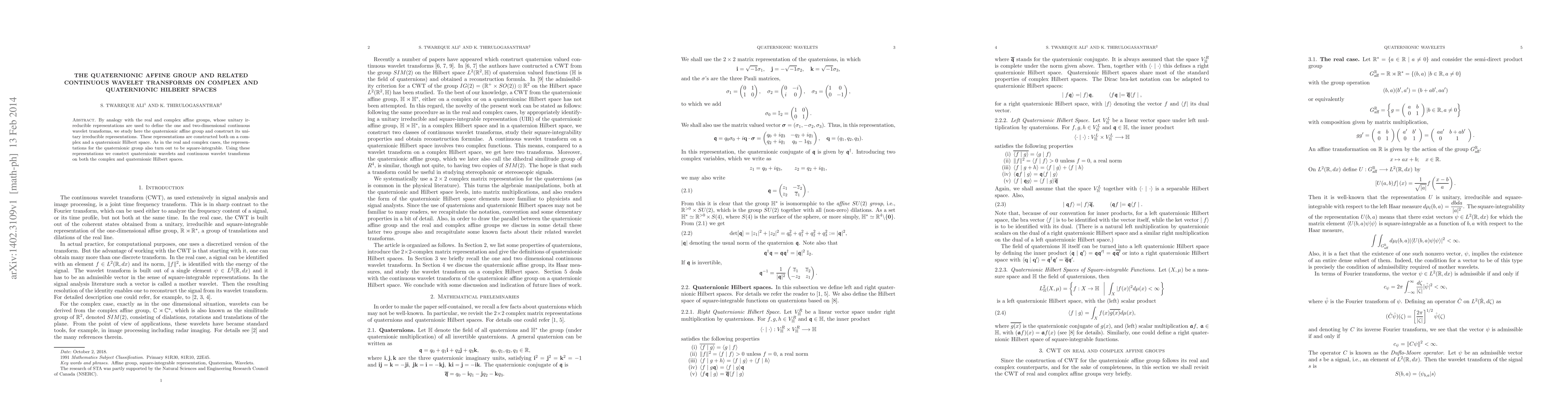 By analogy with the real and complex affine groups, whose unitary irreducible representations are used to define the one and two-dimensional continuous wavelet transforms, we study here the quaternionic affine group and construct its unitary irreducible representations. These representations are constructed both on a complex and a quaternionic Hilbert space. As in the real and complex cases, the representations for the quaternionic group also turn out to be square-integrable. Using these representations we constrct quaternionic wavelets and continuous wavelet transforms on both the complex and quaternionic Hilbert spaces.