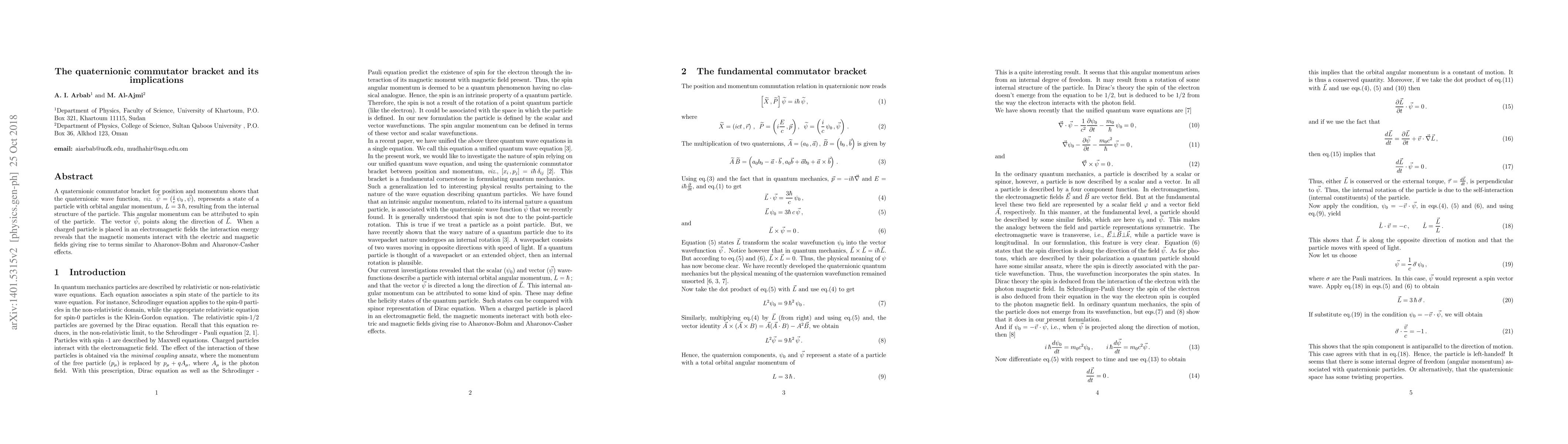 A quaternionic commutator bracket for position and momentum shows that the quaternionic wave function, \emph{viz.} $\widetilde{\psi}=(\frac{i}{c}\,\psi_0\,,\vec{\psi})$, represents a state of a particle with orbital angular momentum, $L=3\,\hbar$, resulting from the internal structure of the particle. This angular momentum can be attributed to spin of the particle. The vector $\vec{\psi}$, points along the direction of $\vec{L}$. When a charged particle is placed in an electromagnetic fields the interaction energy reveals that the magnetic moments interact with the electric and magnetic fields giving rise to terms similar to Aharonov-Bohm and Aharonov-Casher effects.