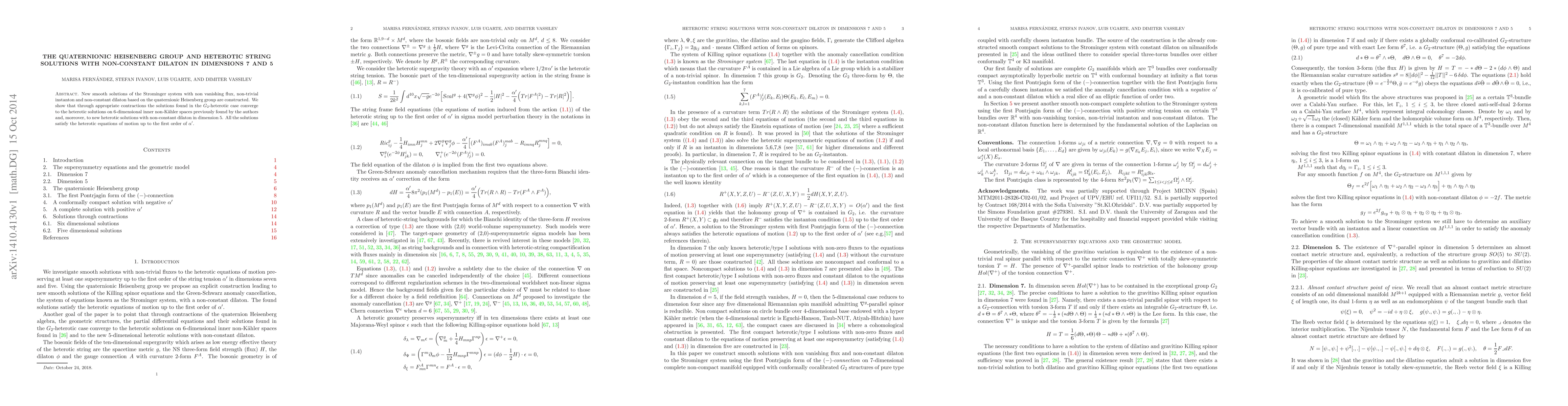 New smooth solutions of the Strominger system with non vanishing flux, non-trivial instanton and non-constant dilaton based on the quaternionic Heisenberg group are constructed. We show that through appropriate contractions the solutions found in the $G_2$-heterotic case converge to the heterotic solutions on 6-dimensional inner non-K\"ahler spaces previously found by the authors and, moreover, to new heterotic solutions with non-constant dilaton in dimension 5. All solutions satisfy the heterotic equations of motion up to the first order of $\alpha^{\prime}$.