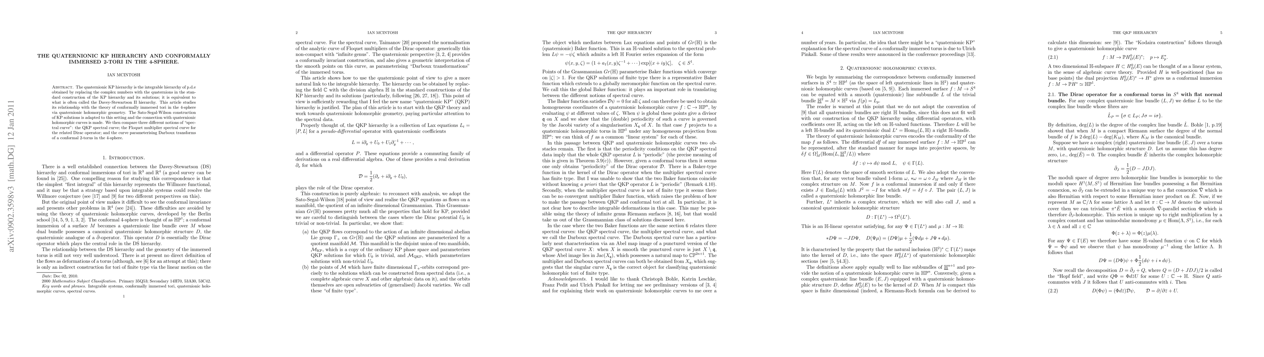 The quaternionic KP hierarchy is the integrable hierarchy of p.d.e obtained by replacing the complex numbers with the quaternions, mutatis mutandis, in the standard construction of the KP hierarchy equations and solutions; it is equivalent to what is often called the Davey-Stewartson II hierarchy. This article studies its relationship with the theory of quaternionic holomorphic 2-tori in HP^1 (which are equivalent to conformally immersed 2-tori in S^4). After describing how the Sato-Segal-Wilson construction of KP solutions (particularly solutions of finite type) carries over to this quaternionic setting, we compare three different notions of "spectral curve": the QKP spectral curve, which arises from an algebra of commuting differential operators; the (unnormalised) Floquet multiplier spectral curve for the related Dirac operator; and the curve parameterising Darboux transforms of a conformal 2-torus in S^4 (in the sense of Bohle, Leschke, Pedit and Pinkall). The latter two are shown to be images of the QKP spectral curve, which need not be smooth. Moreover, it is a singularisation of this QKP spectral curve, rather than the normalised Floquet multiplier curve, which determines the classification of conformally immersed 2-tori of finite spectral genus.