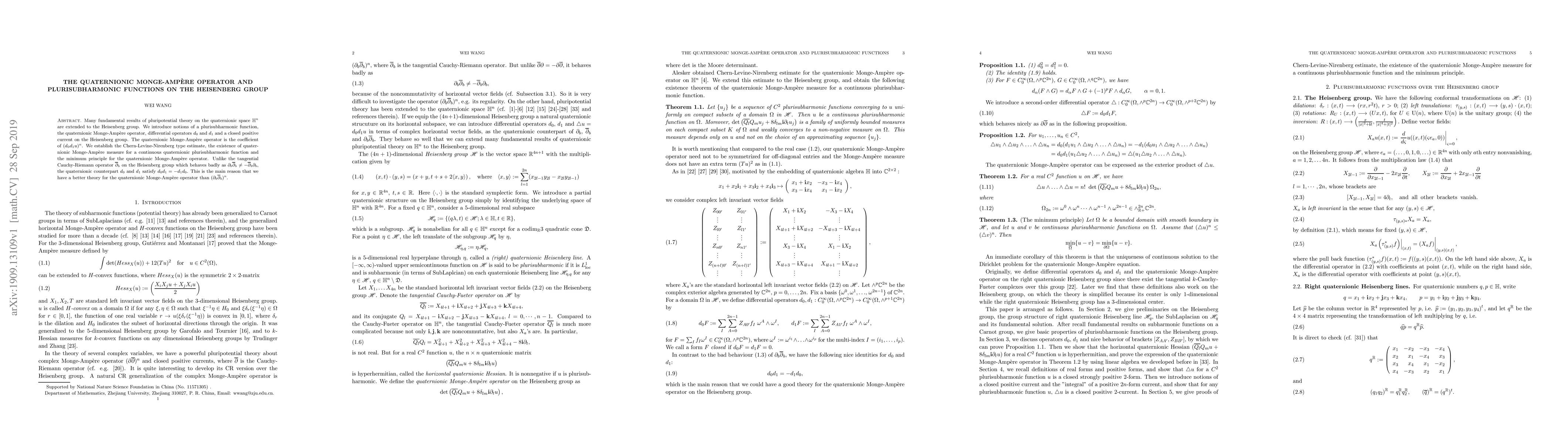 This paper extends pluripotential theory results from quaternionic space $\mathbb{H}^n$ to the Heisenberg group, introducing quaternionic Monge-Ampère operator and plurisubharmonic functions. It establishes a Chern-Levine-Nirenberg estimate, existence of quaternionic Monge-Ampère measure, and a minimum principle, highlighting the better behavior of quaternionic operators compared to the tangential Cauchy-Riemann operator.
