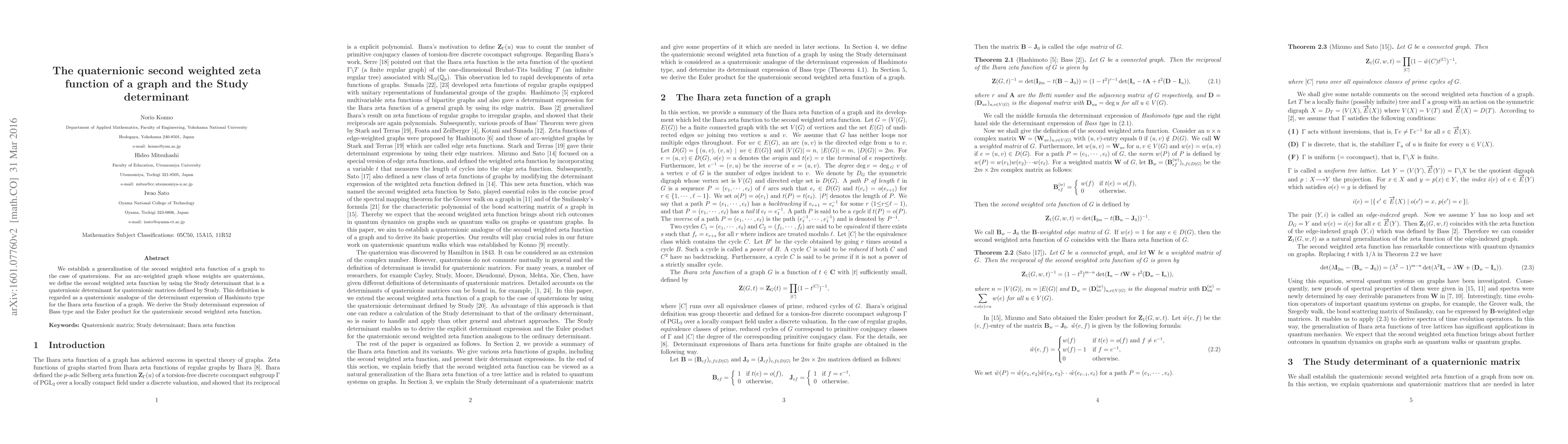 This paper generalizes the second weighted zeta function of a graph to quaternionic weights using the Study determinant, establishing a quaternionic analogue of the Ihara zeta function. The study includes derivations of the Study determinant expression and the Euler product for the quaternionic second weighted zeta function.