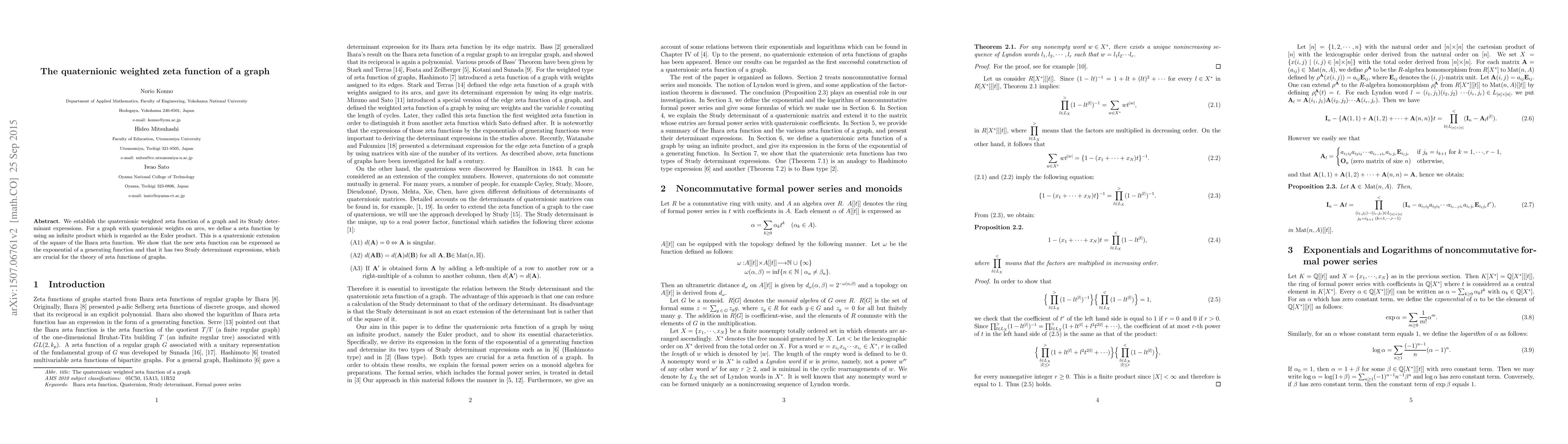 The paper introduces the quaternionic weighted zeta function for graphs with quaternionic arc weights, extending the Ihara zeta function. It demonstrates the function's representation as an exponential of a generating function and provides two Study determinant expressions essential for graph zeta function theory.