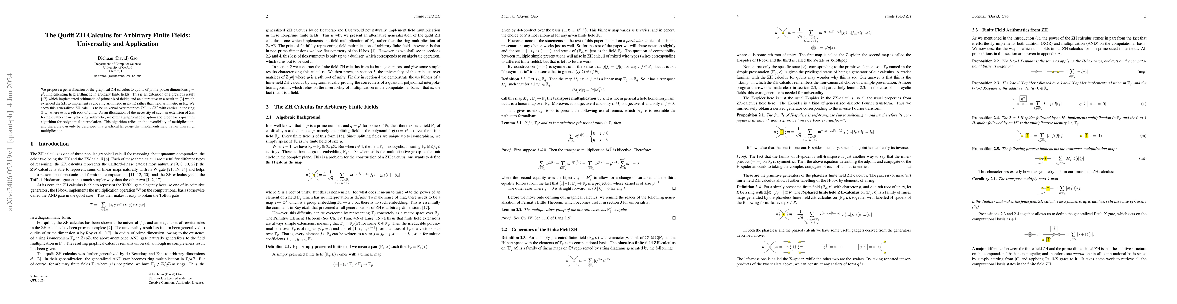 This paper generalizes the ZH calculus for qudits in prime-power dimensions over arbitrary finite fields, demonstrating its universality and illustrating its application with a quantum polynomial interpolation algorithm that necessitates field arithmetic. The approach contrasts with cyclic ring arithmetic implementations.