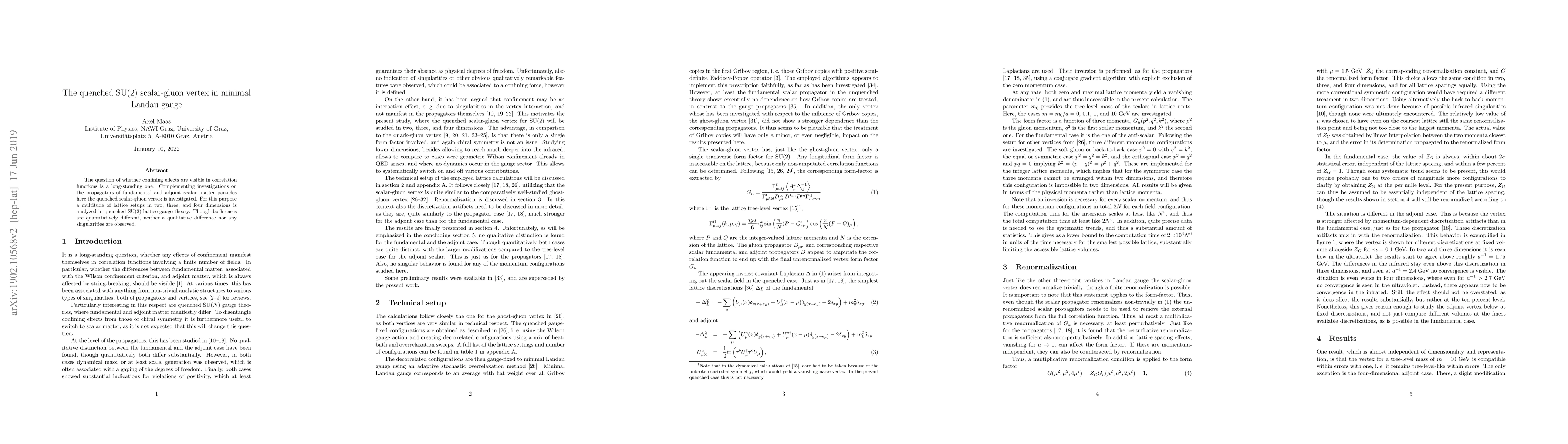 The question of whether confining effects are visible in correlation functions is a long-standing one. Complementing investigations on the propagators of fundamental and adjoint scalar matter particles here the quenched scalar-gluon vertex is investigated. For this purpose a multitude of lattice setups in two, three, and four dimensions is analyzed in quenched SU(2) lattice gauge theory. Though both cases are quantitatively different, neither a qualitative difference nor any singularities are observed.