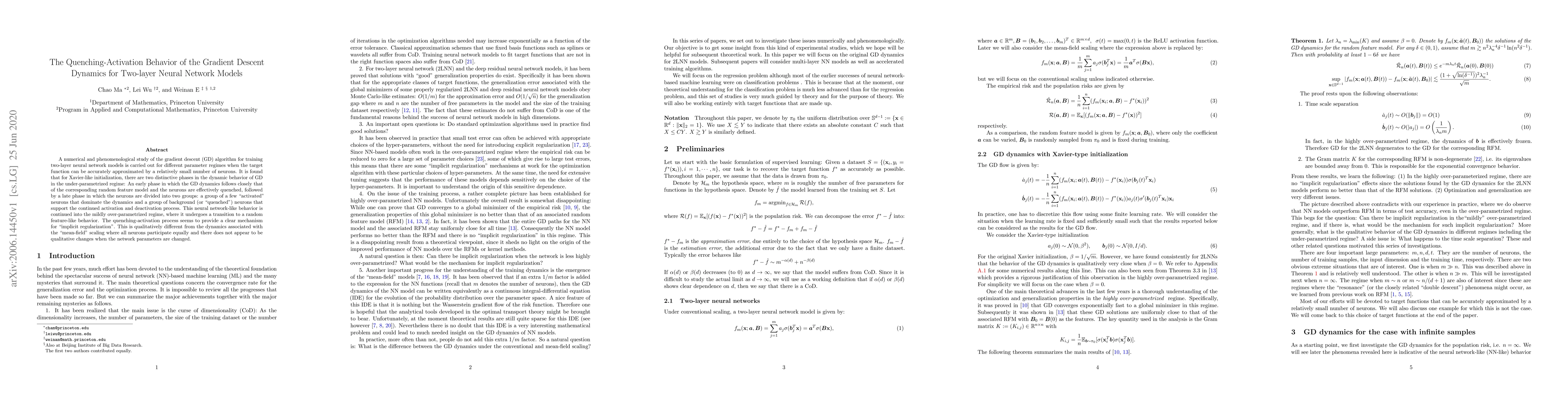 A numerical and phenomenological study of the gradient descent (GD) algorithm for training two-layer neural network models is carried out for different parameter regimes when the target function can be accurately approximated by a relatively small number of neurons. It is found that for Xavier-like initialization, there are two distinctive phases in the dynamic behavior of GD in the under-parametrized regime: An early phase in which the GD dynamics follows closely that of the corresponding random feature model and the neurons are effectively quenched, followed by a late phase in which the neurons are divided into two groups: a group of a few "activated" neurons that dominate the dynamics and a group of background (or "quenched") neurons that support the continued activation and deactivation process. This neural network-like behavior is continued into the mildly over-parametrized regime, where it undergoes a transition to a random feature-like behavior. The quenching-activation process seems to provide a clear mechanism for "implicit regularization". This is qualitatively different from the dynamics associated with the "mean-field" scaling where all neurons participate equally and there does not appear to be qualitative changes when the network parameters are changed.