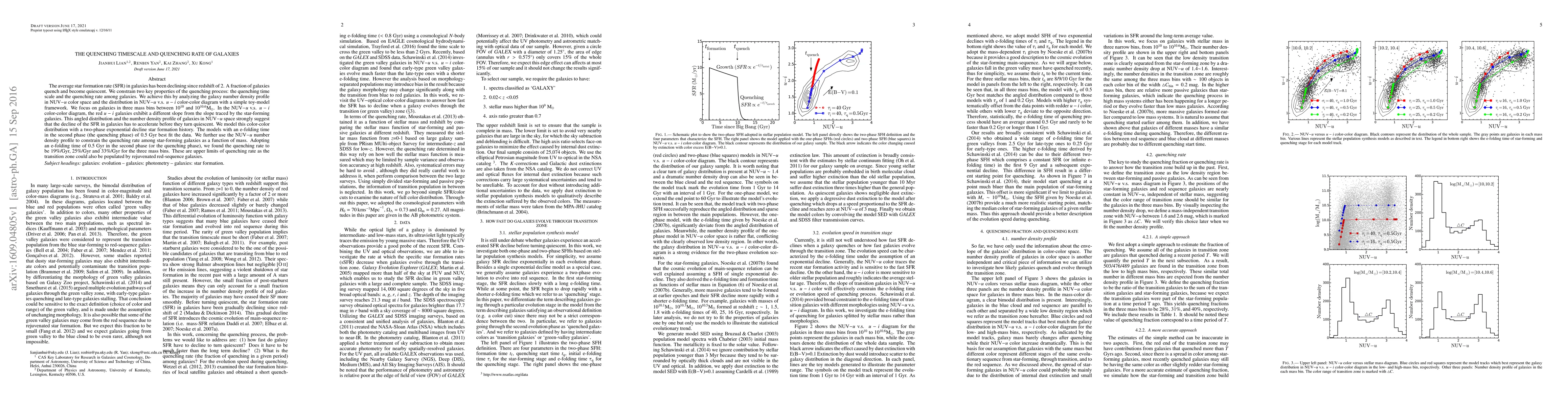 The average star formation rate (SFR) in galaxies has been declining since redshift of 2. A fraction of galaxies quench and become quiescent. We constrain two key properties of the quenching process: the quenching time scale and the quenching rate among galaxies. We achieve this by analyzing the galaxy number density profile in NUV-u color space and the distribution in NUV-u v.s. u-i color-color diagram with a simple toy-model framework. We focus on galaxies in three mass bins between 10 to 10 and 10 to 10.6 solar mass. In the NUV-u v.s. u-i color-color diagram, the red u-i galaxies exhibit a different slope from the slope traced by the star-forming galaxies. This angled distribution and the number density profile of galaxies in NUV-u space strongly suggest that the decline of the SFR in galaxies has to accelerate before they turn quiescent. We model this color-color distribution with a two-phase exponential decline star formation history. The models with an e-folding time in the second phase (the quenching phase) of 0.5 Gyr best fit the data. We further use the NUV-u number density profile to constrain the quenching rate among star-forming galaxies as a function of mass. Adopting an e-folding time of 0.5 Gyr in the second phase (or the quenching phase), we found the quenching rate to be 19%/Gyr, 25%/Gyr and 33%/Gyr for the three mass bins. These are upper limits of quenching rate as the transition zone could also be populated by rejuvenated red-sequence galaxies.