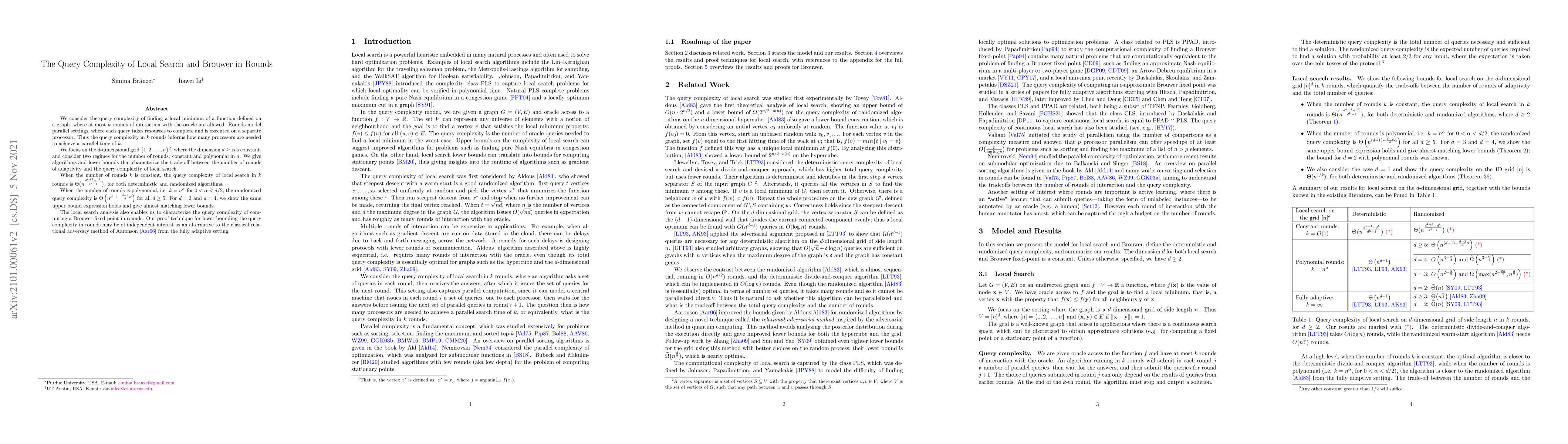 We consider the query complexity of finding a local minimum of a function defined on a graph, where at most $k$ rounds of interaction with the oracle are allowed. Rounds model parallel settings, where each query takes resources to complete and is executed on a separate processor. Thus the query complexity in $k$ rounds informs how many processors are needed to achieve a parallel time of $k$. We focus on the d-dimensional grid $[n]^d$, where the dimension $d$ is a constant, and consider two regimes for the number of rounds: constant and polynomial in n. We give algorithms and lower bounds that characterize the trade-off between the number of rounds of adaptivity and the query complexity of local search. When the number of rounds $k$ is constant, we show that the query complexity of local search in $k$ rounds is $\Theta\bigl(n^{\frac{d^{k+1} - d^k}{d^k - 1}}\bigl)$, for both deterministic and randomized algorithms. When the number of rounds is polynomial, i.e. $k = n^{\alpha}$ for $0 < \alpha < d/2$, the randomized query complexity is $\Theta\left(n^{d-1 - \frac{d-2}{d}\alpha}\right)$ for all $d \geq 5$. For $d=3$ and $d=4$, we show the same upper bound expression holds and give almost matching lower bounds. The local search analysis also enables us to characterize the query complexity of computing a Brouwer fixed point in rounds. Our proof technique for lower bounding the query complexity in rounds may be of independent interest as an alternative to the classical relational adversary method of Aaronson from the fully adaptive setting.