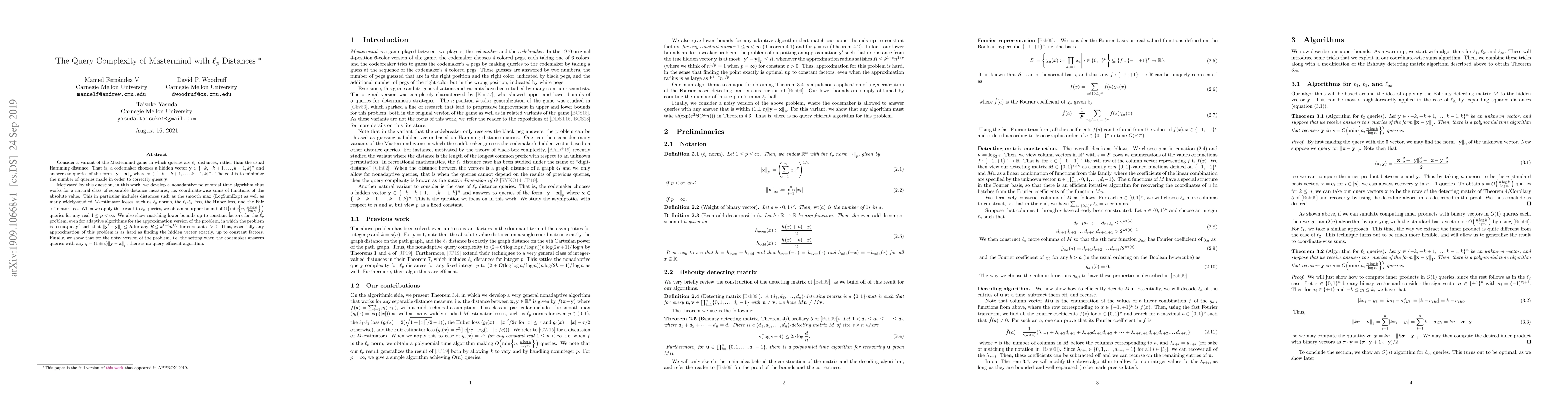 This paper explores a variant of Mastermind where queries are based on $\ell_p$ distances instead of Hamming distance, aiming to minimize query count to guess the hidden vector. The authors develop a nonadaptive polynomial-time algorithm for a class of separable distance measures, achieving an upper bound of $O\left(\min\left\{n,\frac{n\log k}{\log n}\right\}\right)$ queries for $\ell_p$ distances, and prove matching lower bounds, indicating the difficulty of approximating the hidden vector.